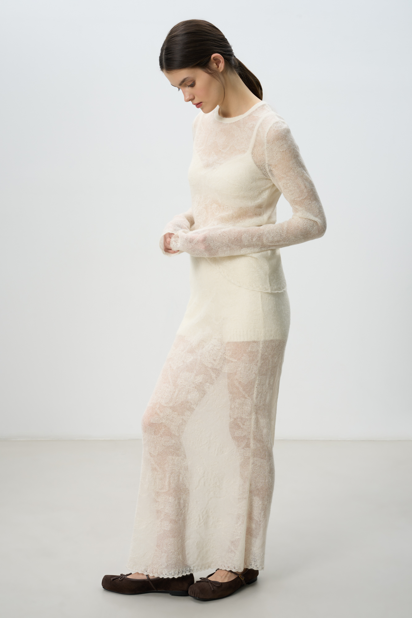 Openwork maxi-length skirt made of baby alpaca wool and super kid mohair. Model with elastic waistband. The bottom of the product is decorated with a lace border. No lining.