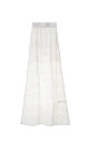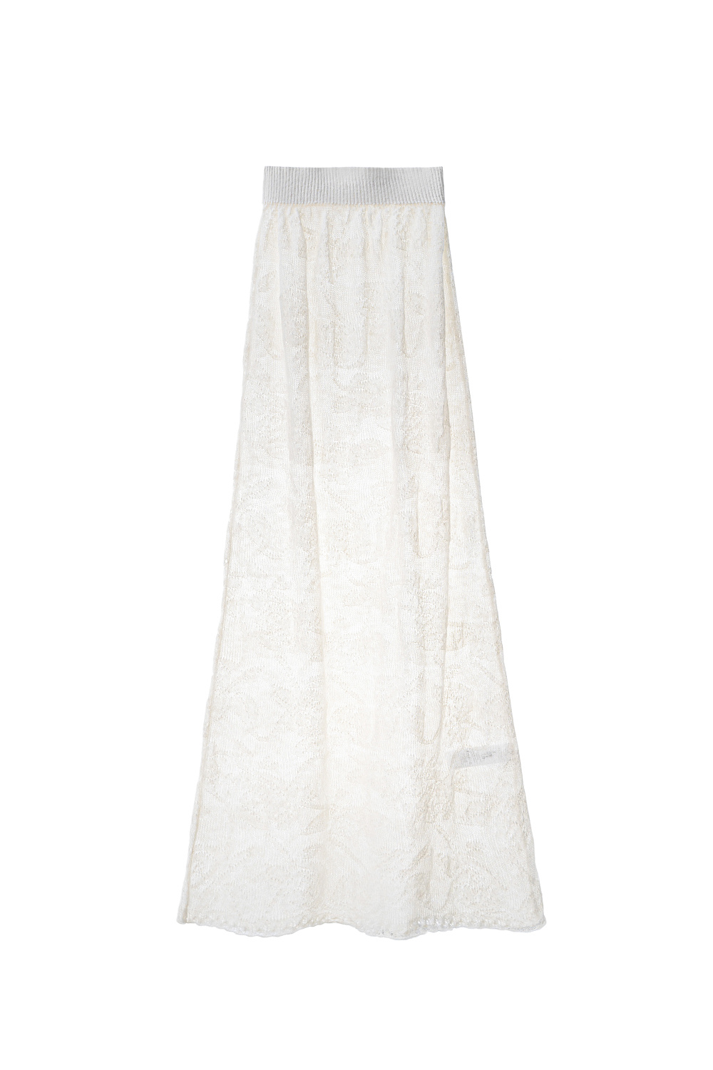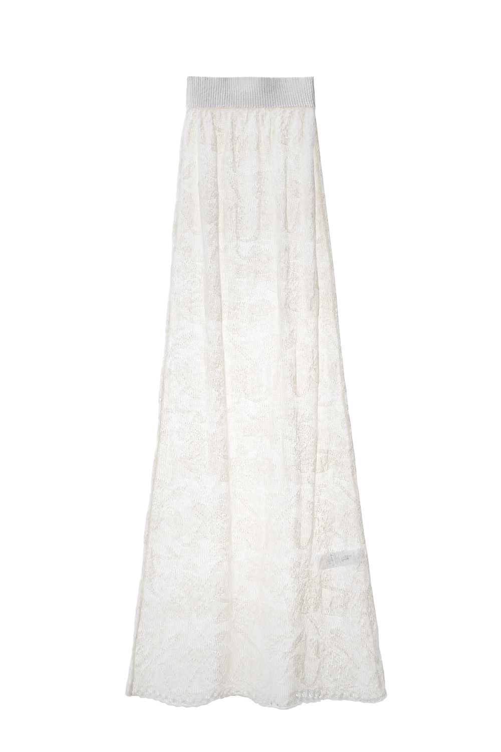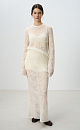 Openwork maxi-length skirt made of baby alpaca wool and super kid mohair. Model with elastic waistband. The bottom of the product is decorated with a lace border. No lining.