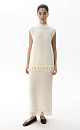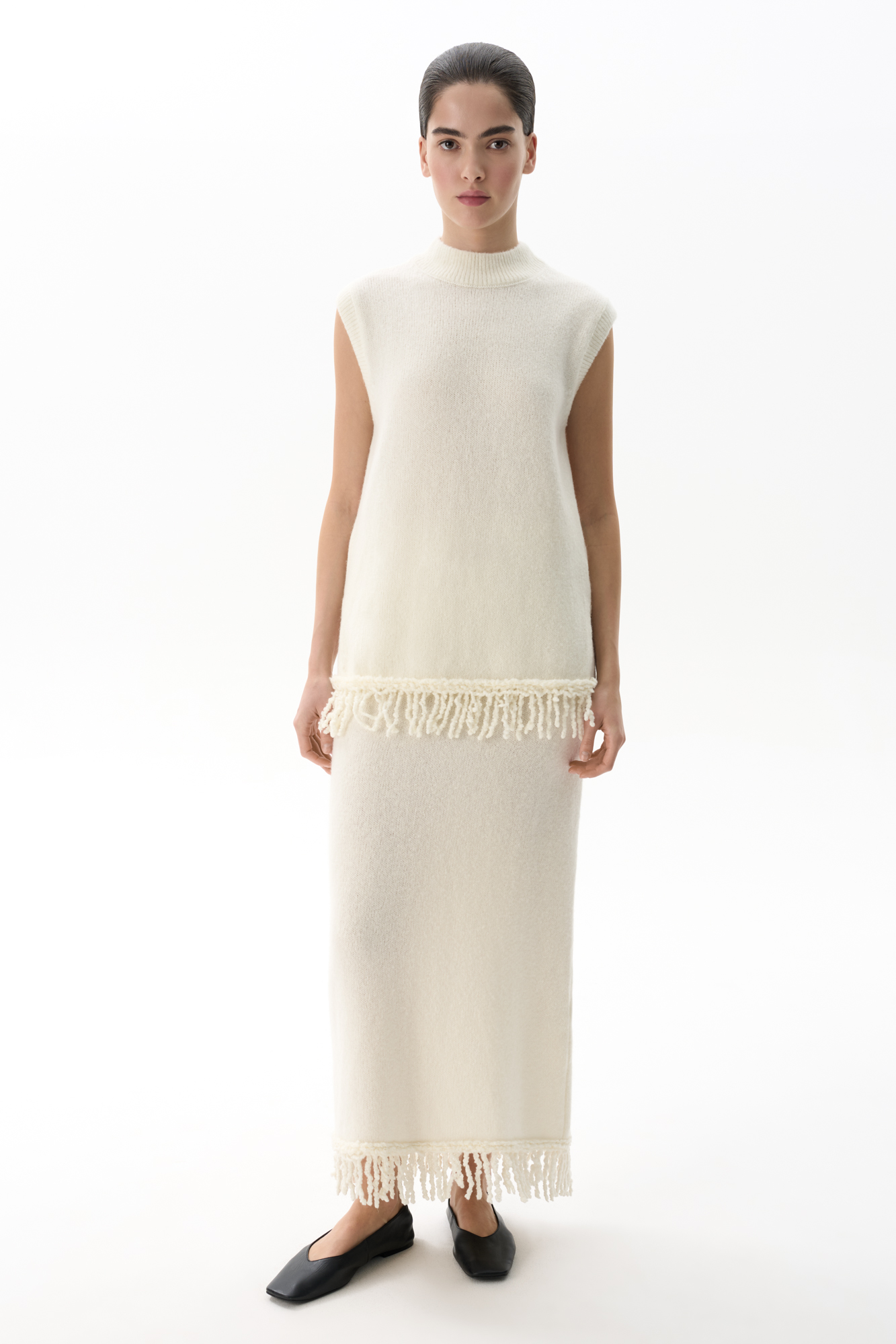 Maxi-length knitted skirt made of ultra-fine merino wool with added cotton. Straight silhouette model with a wide elastic waistband. The product is decorated with bouclé fringe along the bottom.