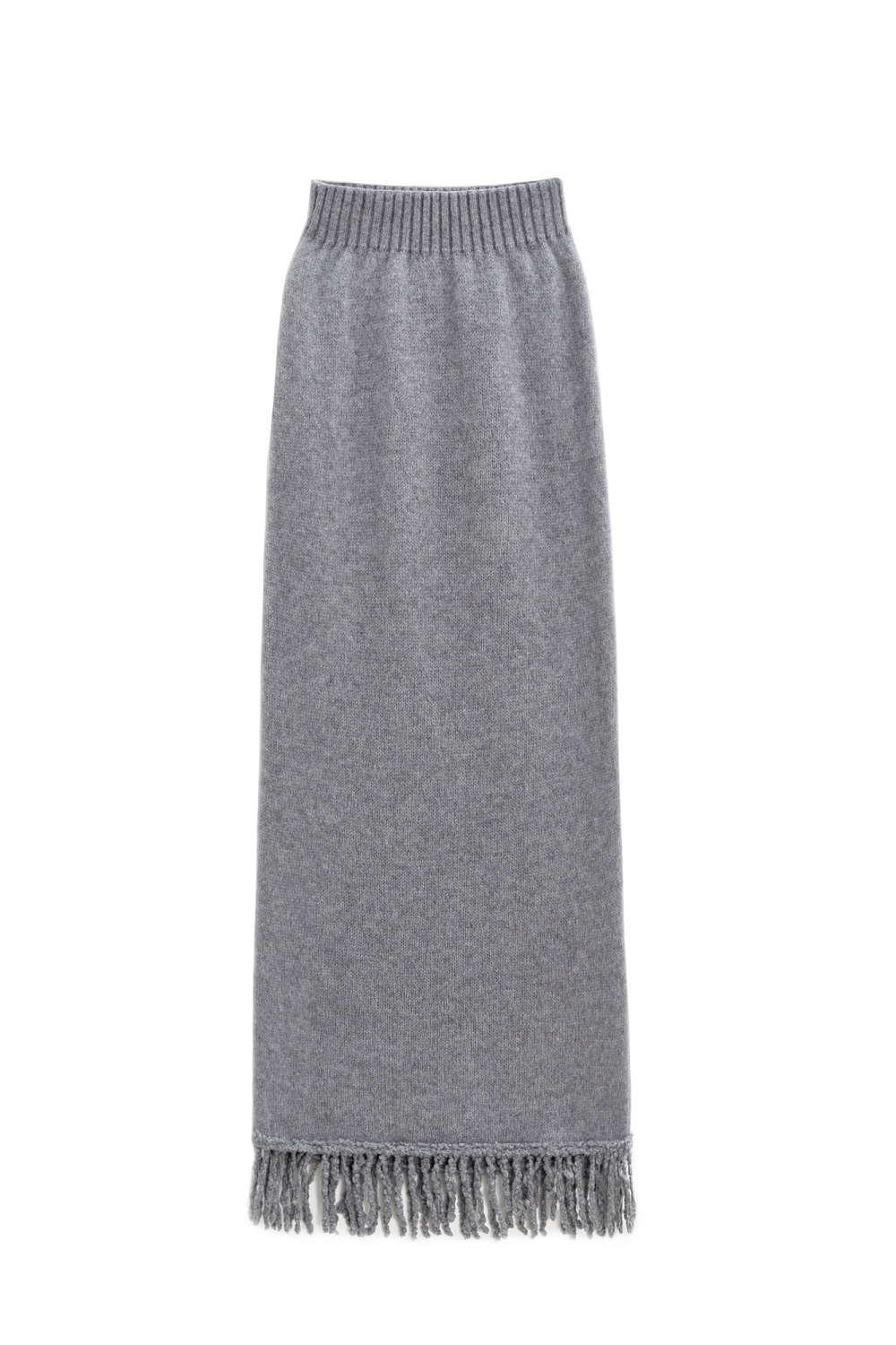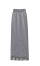 Maxi-length knitted skirt made of ultra-fine merino wool with added cotton. Straight silhouette model with a wide elastic waistband. The product is decorated with bouclé fringe along the bottom.