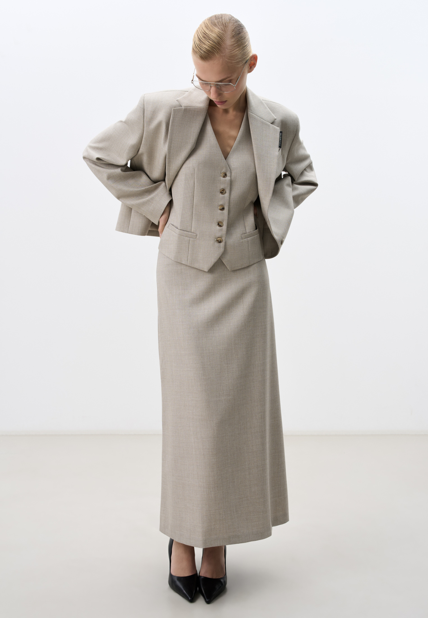 Maxi length skirt made of wool. A-line design with belt loops and side zip fastening. You can complement the look with a vest and jacket.