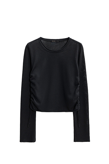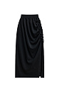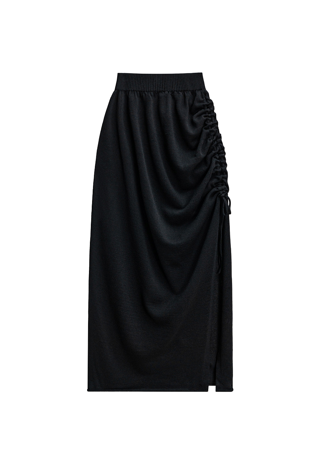 Maxi length skirt made of viscose. The model has a fitted silhouette with a wide elastic waistband, asymmetrical drapery and a drawstring.