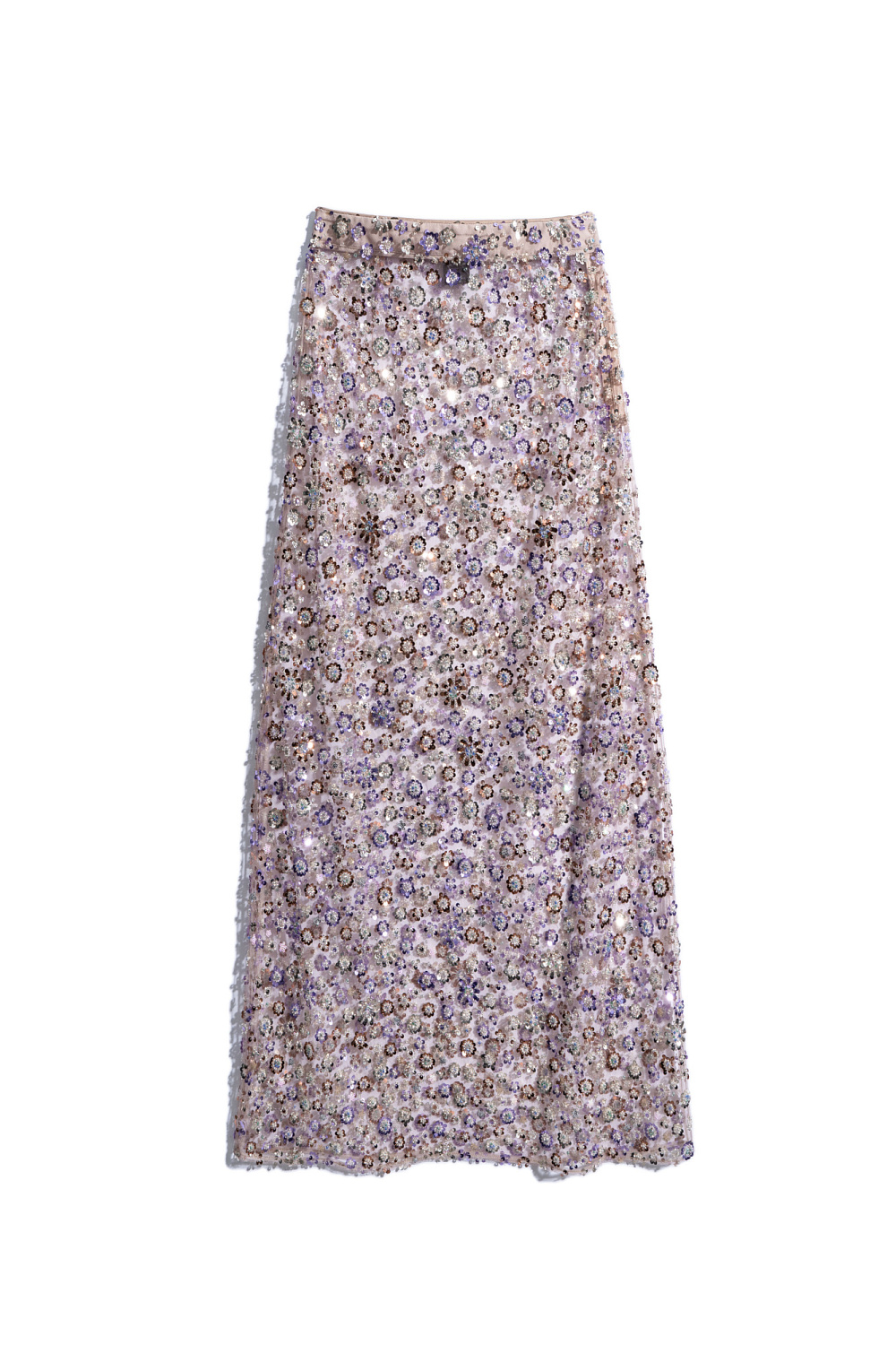 Maxi length skirt with floral patterns embroidered with sequins and beads. Concealed zip fastening. The product is unlined.