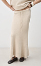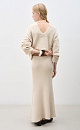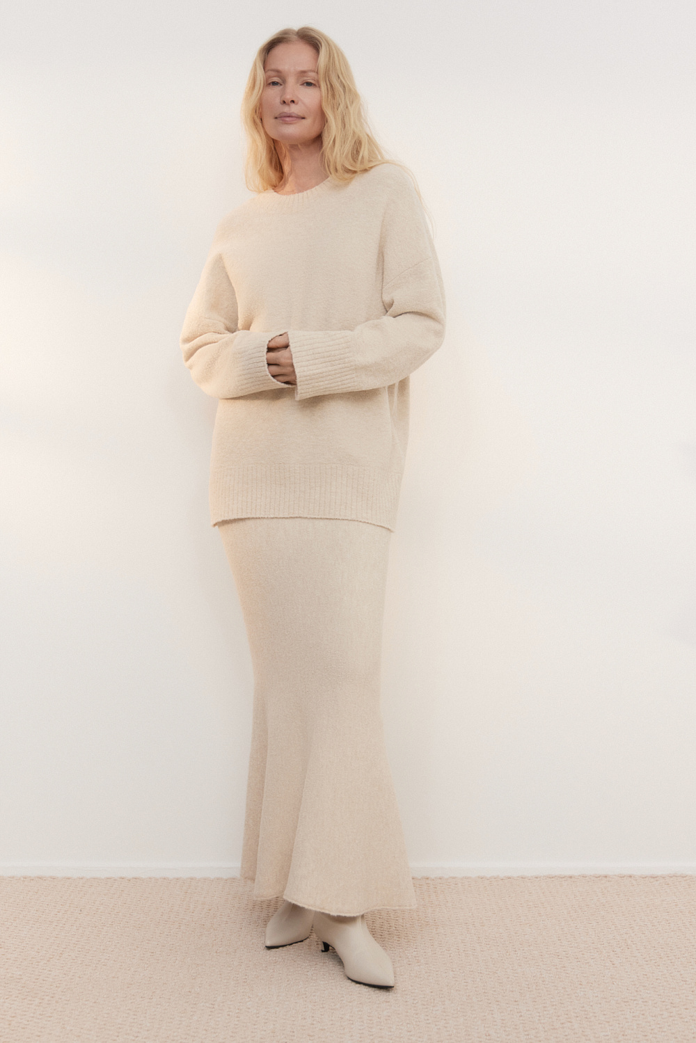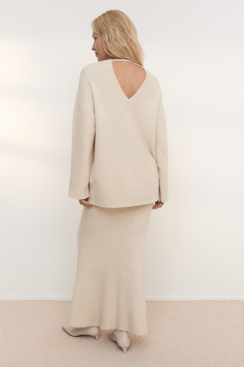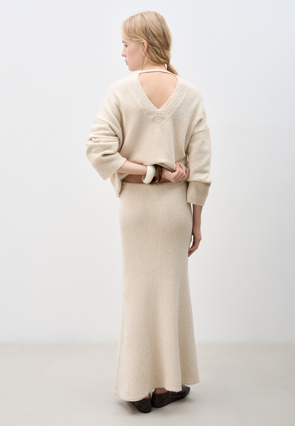 Maxi-length knitted skirt made of bouclé yarn. A fitted model with a flared hem and a belt complemented by a drawstring. You can complement the look with a jumper in the same style.