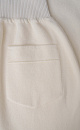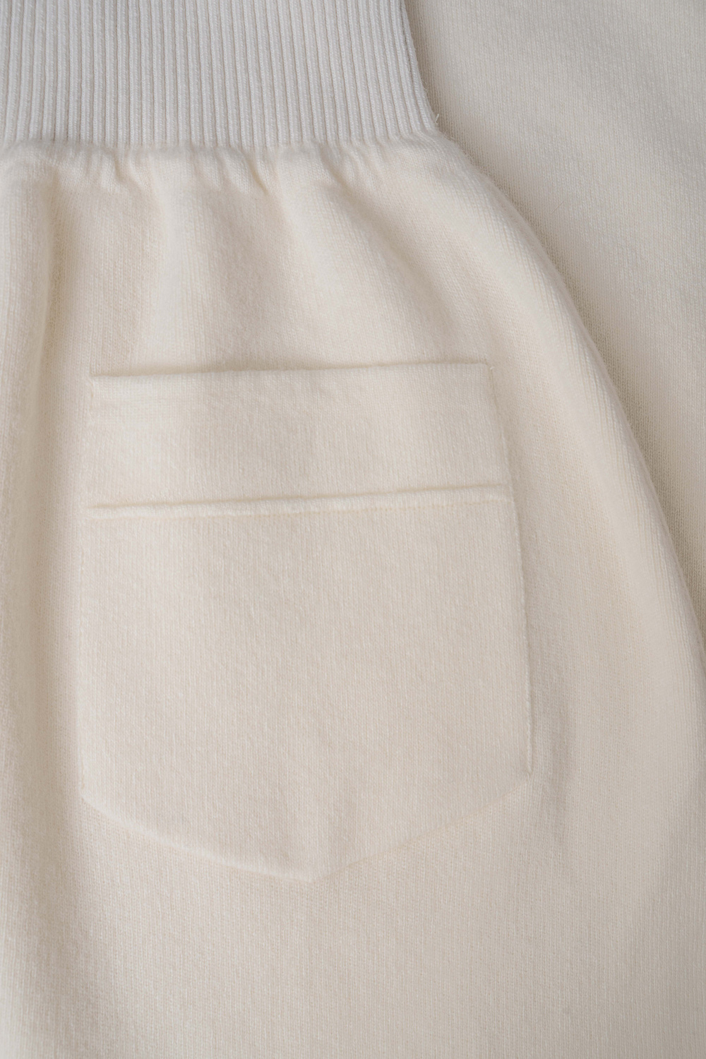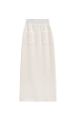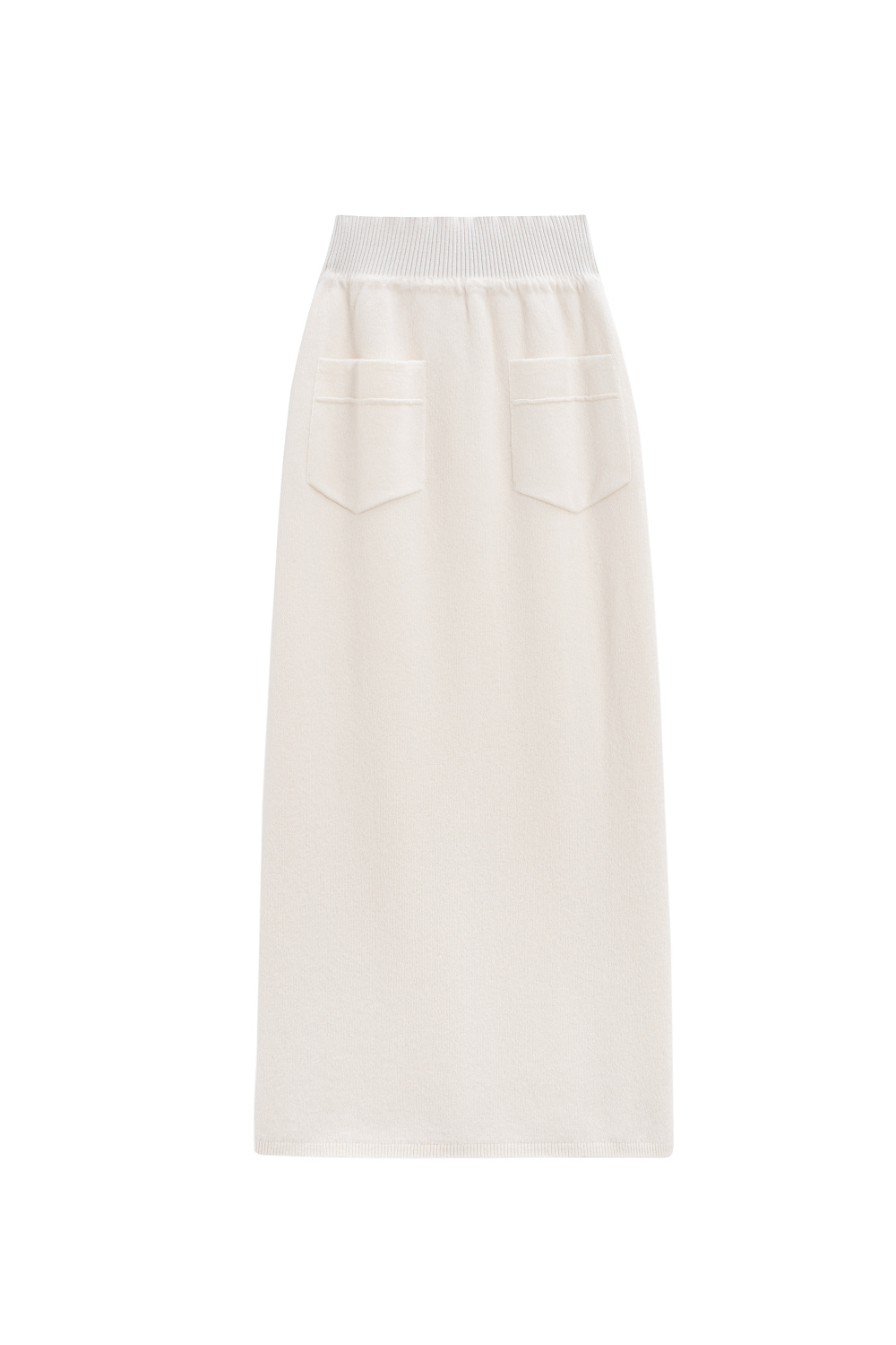 Maxi-length knitted cashmere and wool skirt. Fitted with a wide ribbed elastic waistband, a drawstring and two patch pockets at the back. The model is decorated with a knitted logo