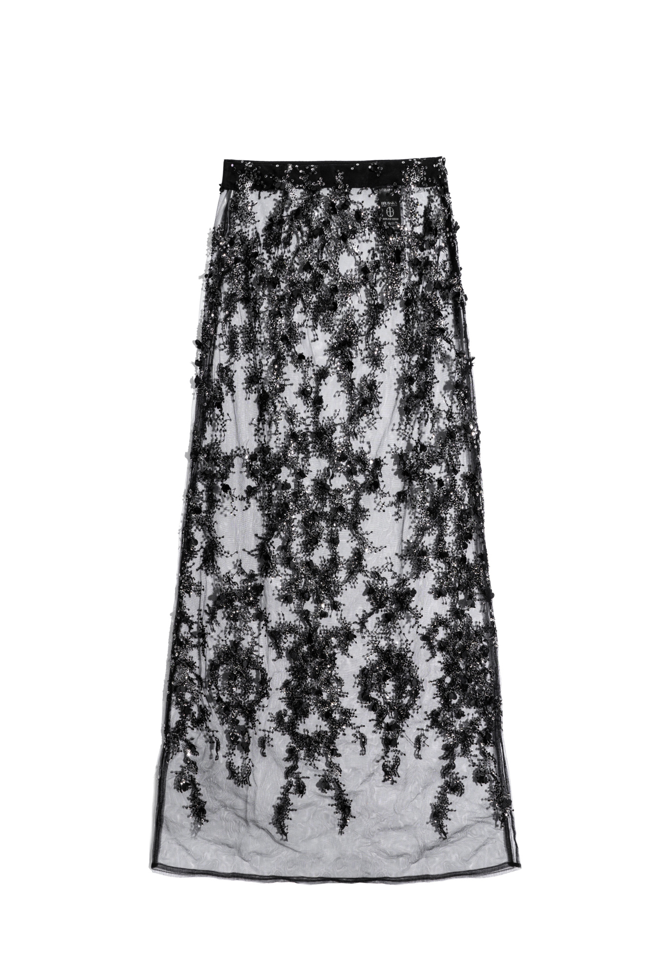 Maxi length skirt with floral patterns embroidered with sequins. Concealed zip fastening. The product is unlined.