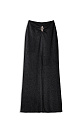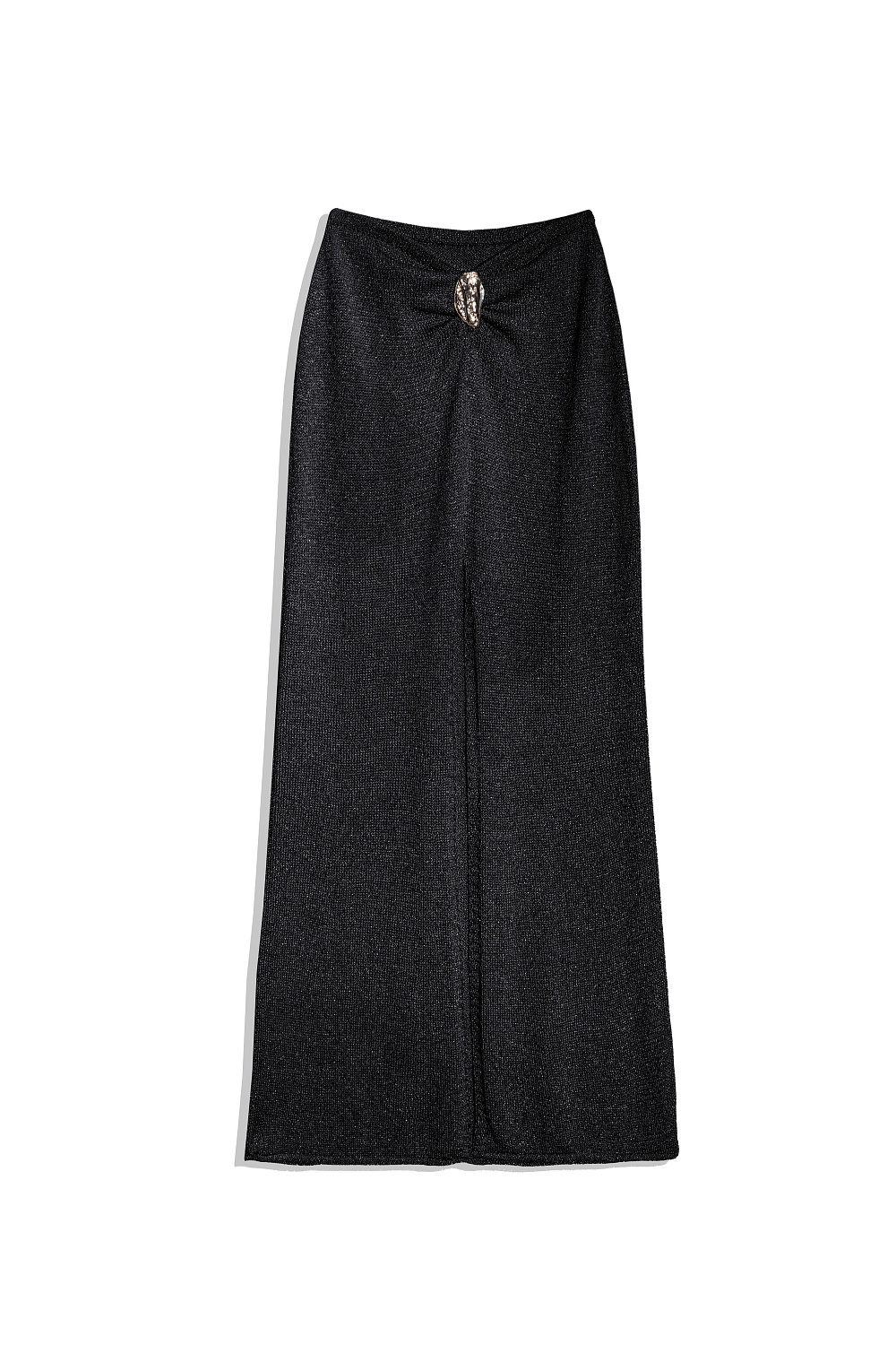 Maxi-length knitted skirt made of viscose with lurex. Model with a high slit at the front, a roll at the hem and an accent element at the waistband.