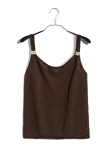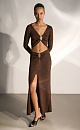 Maxi-length knitted skirt made of viscose with lurex. Model with a high slit at the front, a roll at the hem and an accent element at the waistband.