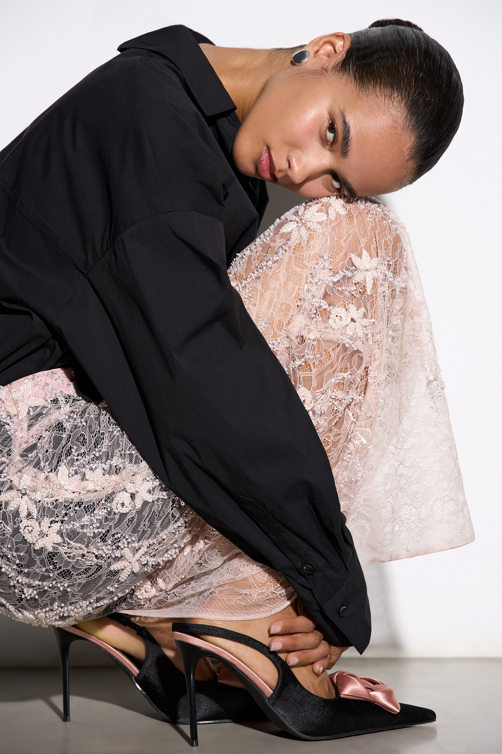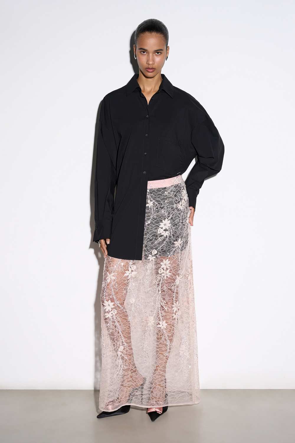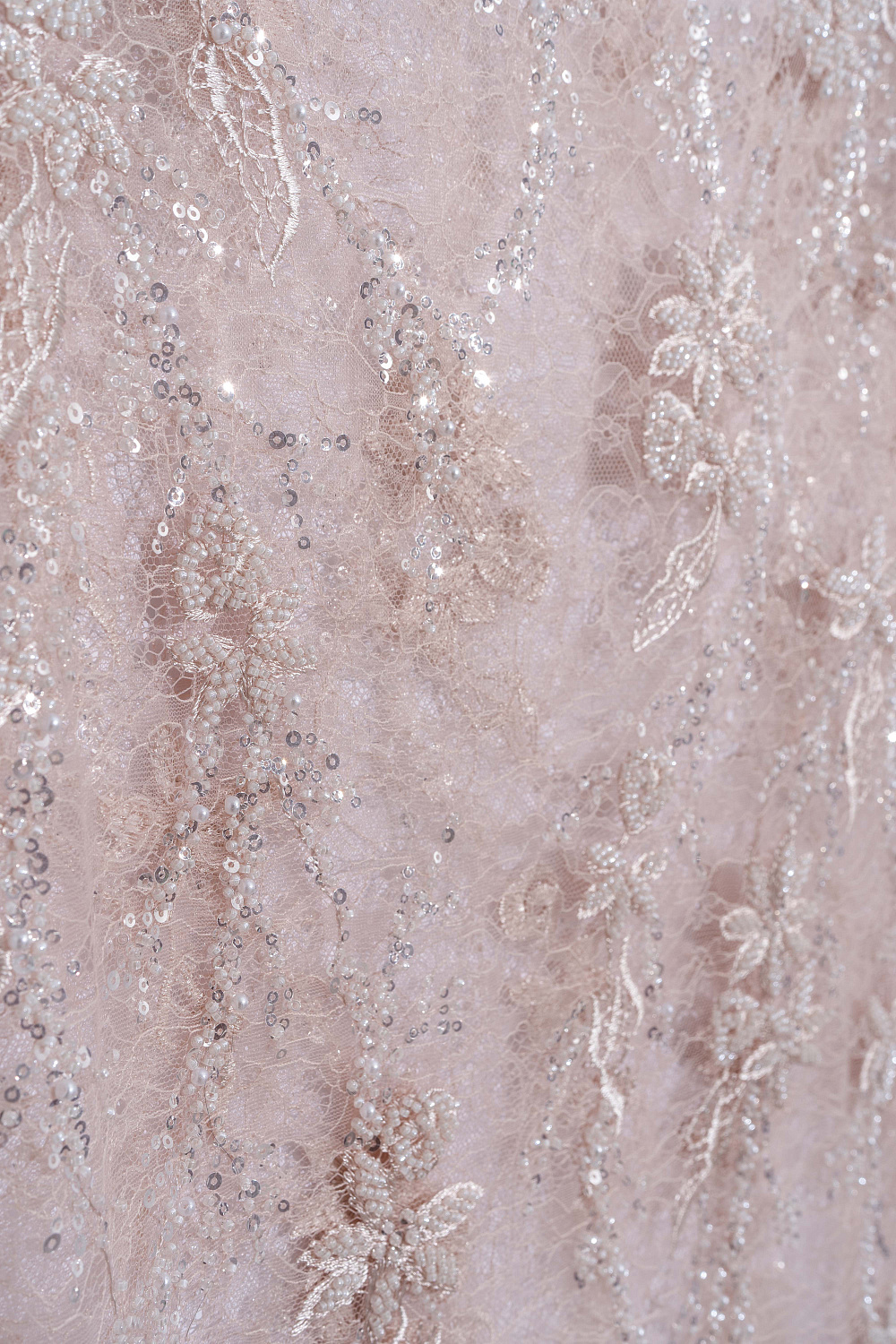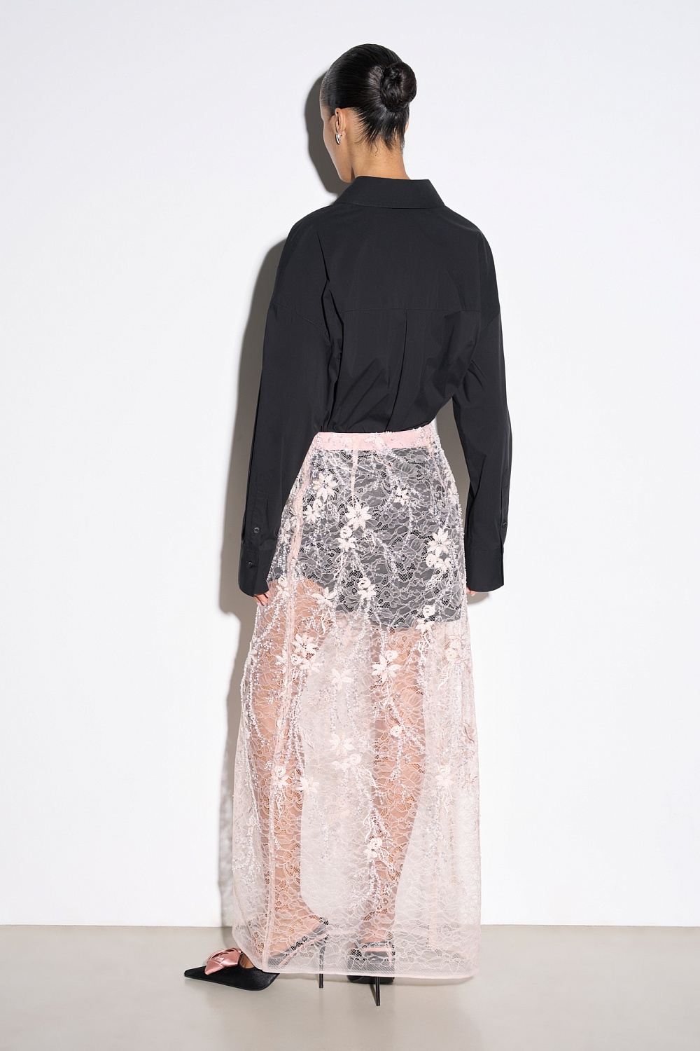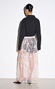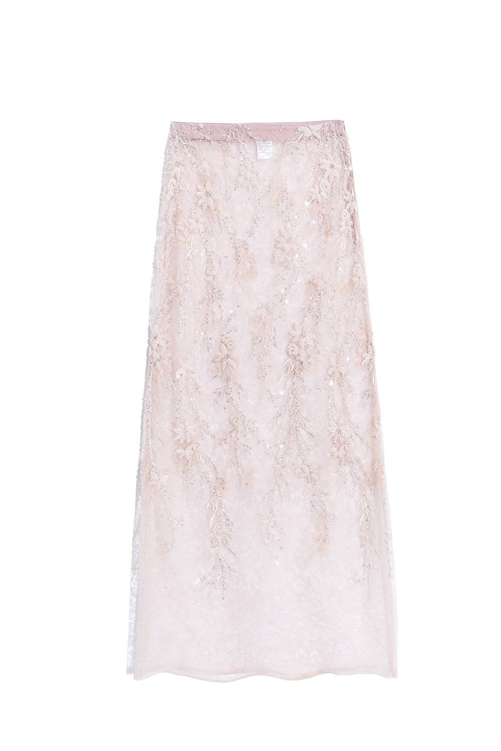 Maxi-length lace skirt with floral patterns, embroidered with beads and sequins. Concealed zip fastening. The product is made without lining.