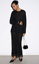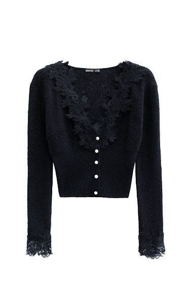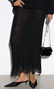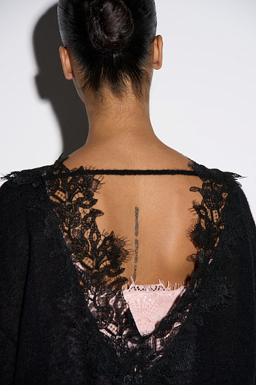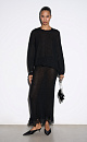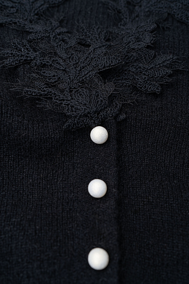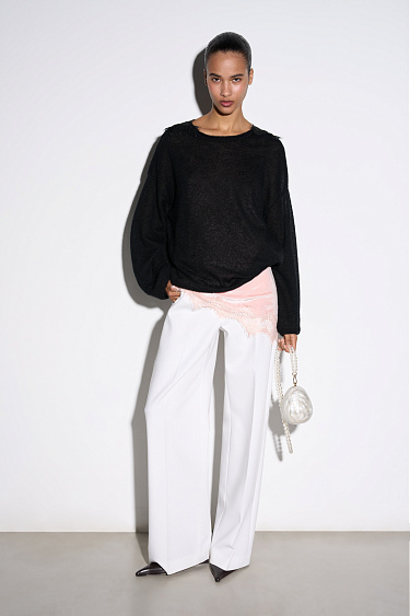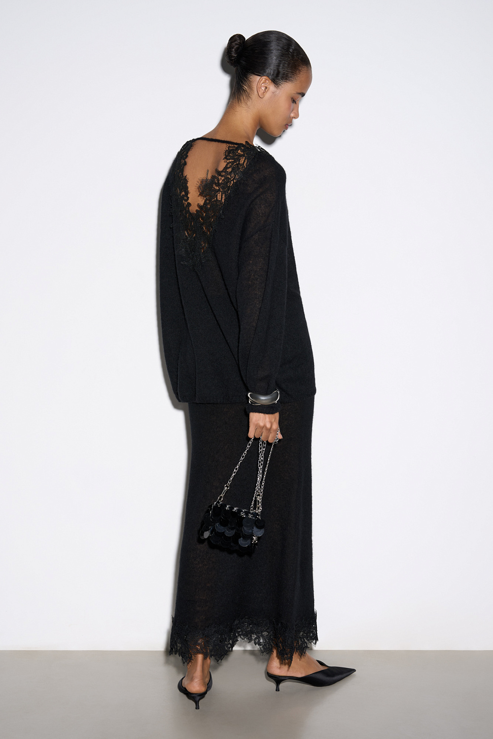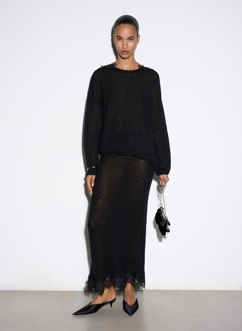 Knitted skirt made of extrafine merino wool and extrafine alpaca. A-line model with a wide elastic waistband. The hem of the product is decorated with lace.