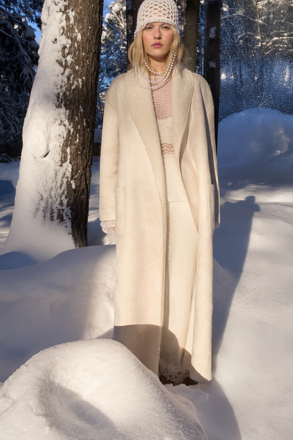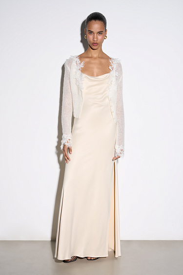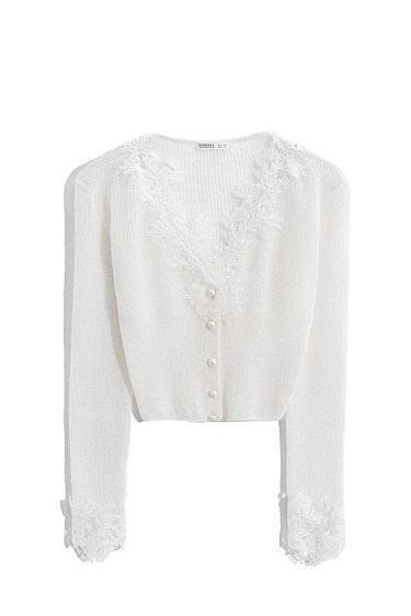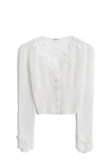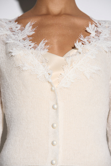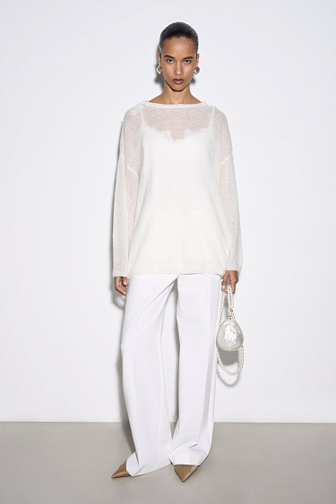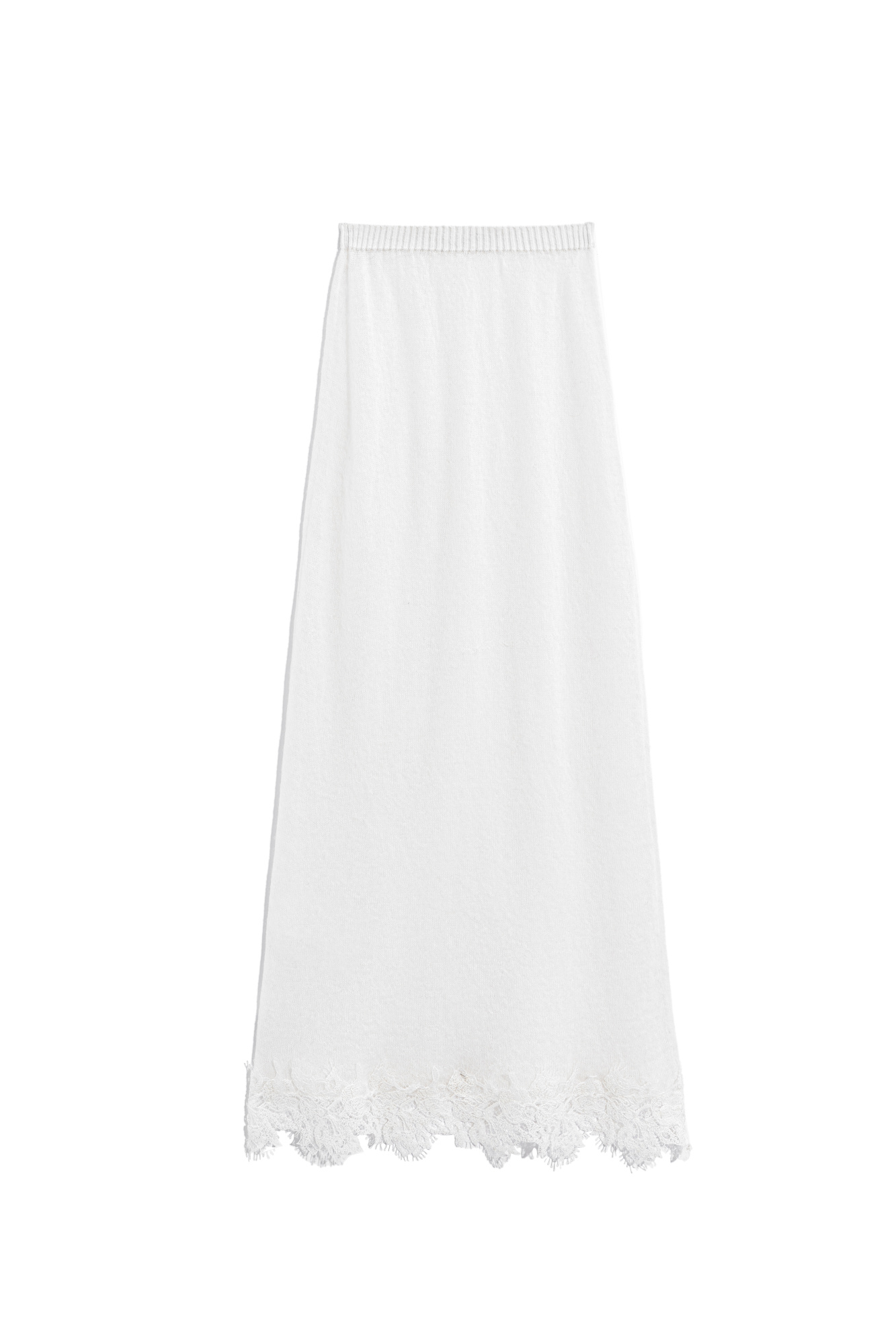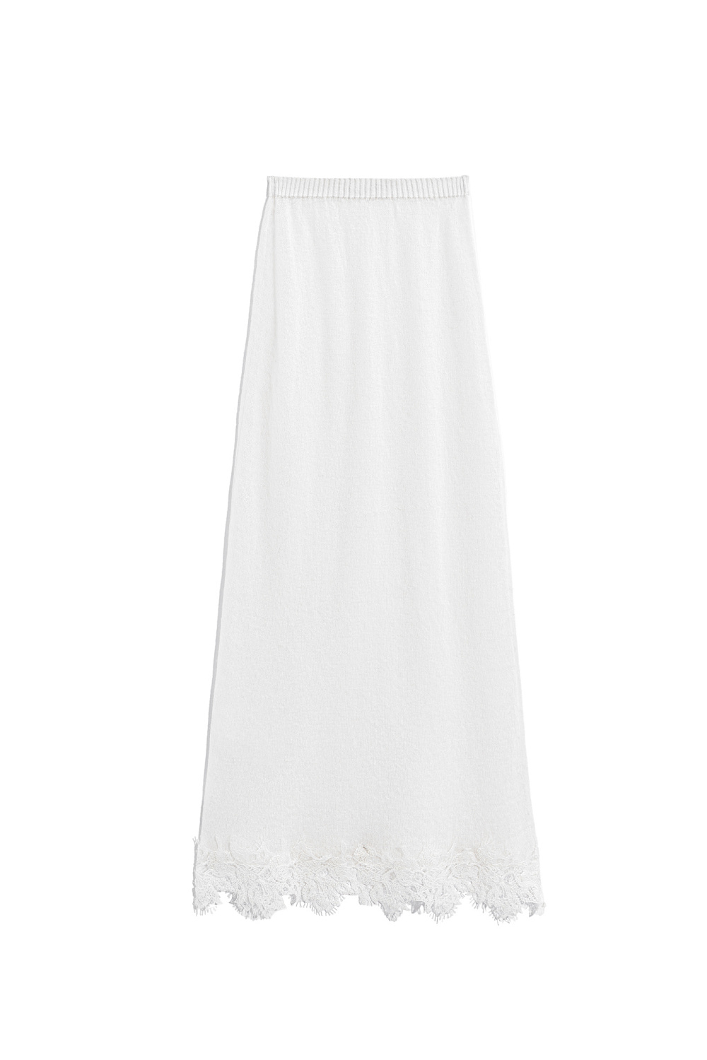 Knitted skirt made of extrafine merino wool and extrafine alpaca. A-line model with a wide elastic waistband. The hem of the product is decorated with lace.