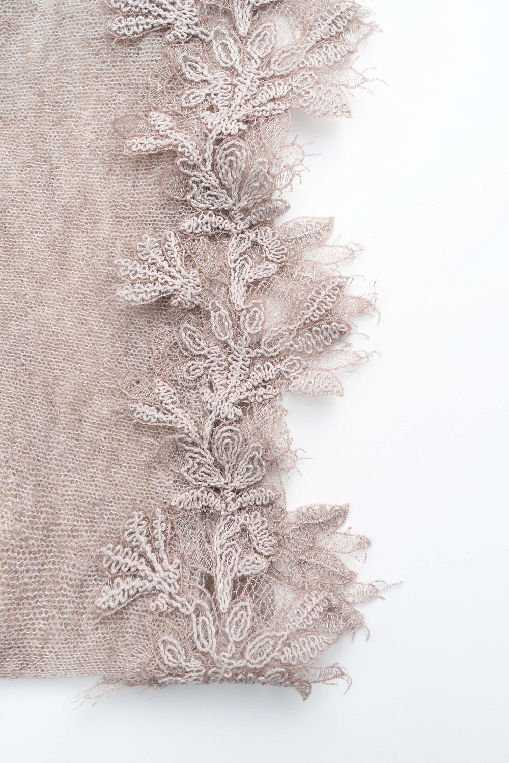 Knitted skirt made of extrafine merino wool and extrafine alpaca. A-line model with a wide elastic waistband. The hem of the product is decorated with lace.