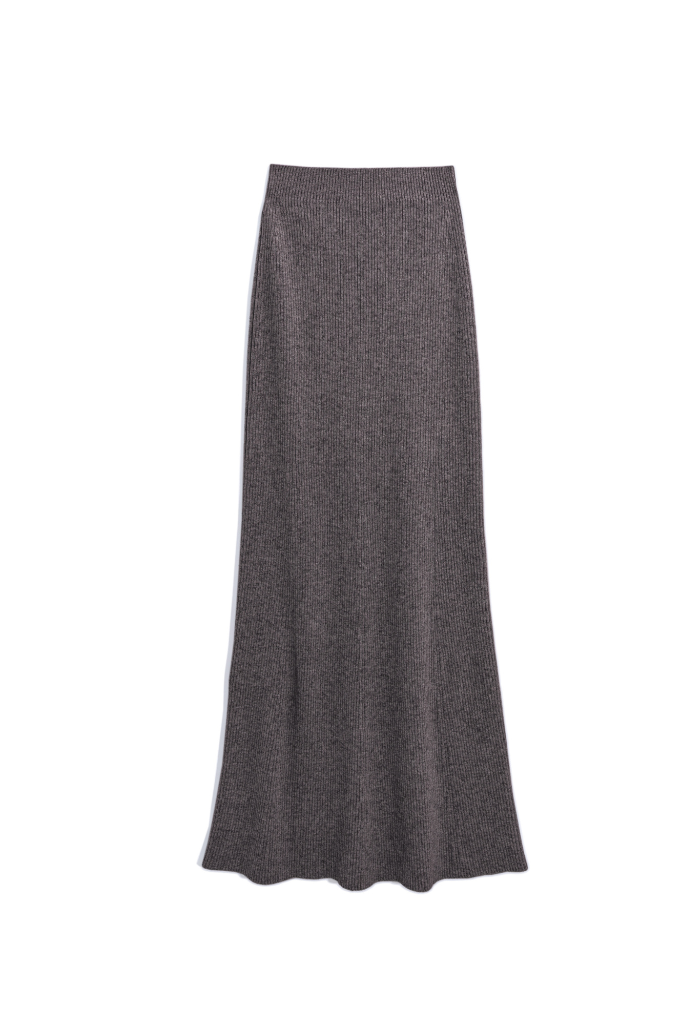 Maxi-length knitted cashmere and wool skirt. The fit model is made in a wide rib.