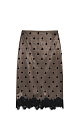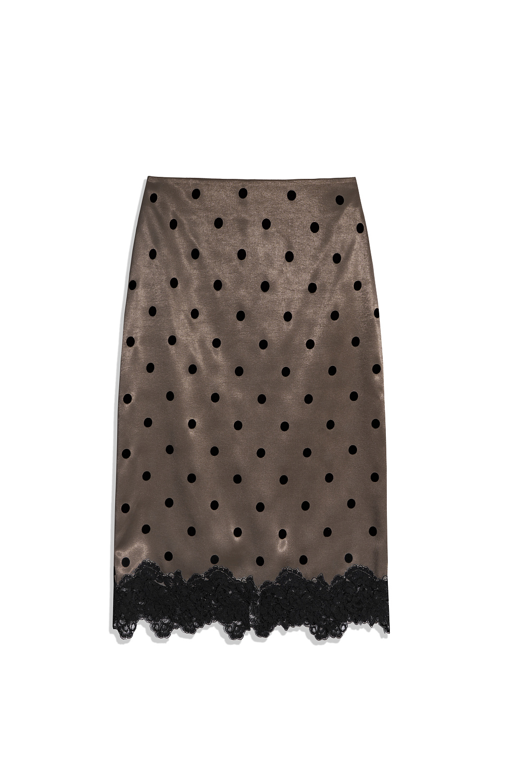 Midi length satin polka dot skirt. Fitted model with hidden zipper closure. The hem of the product is decorated with lace.