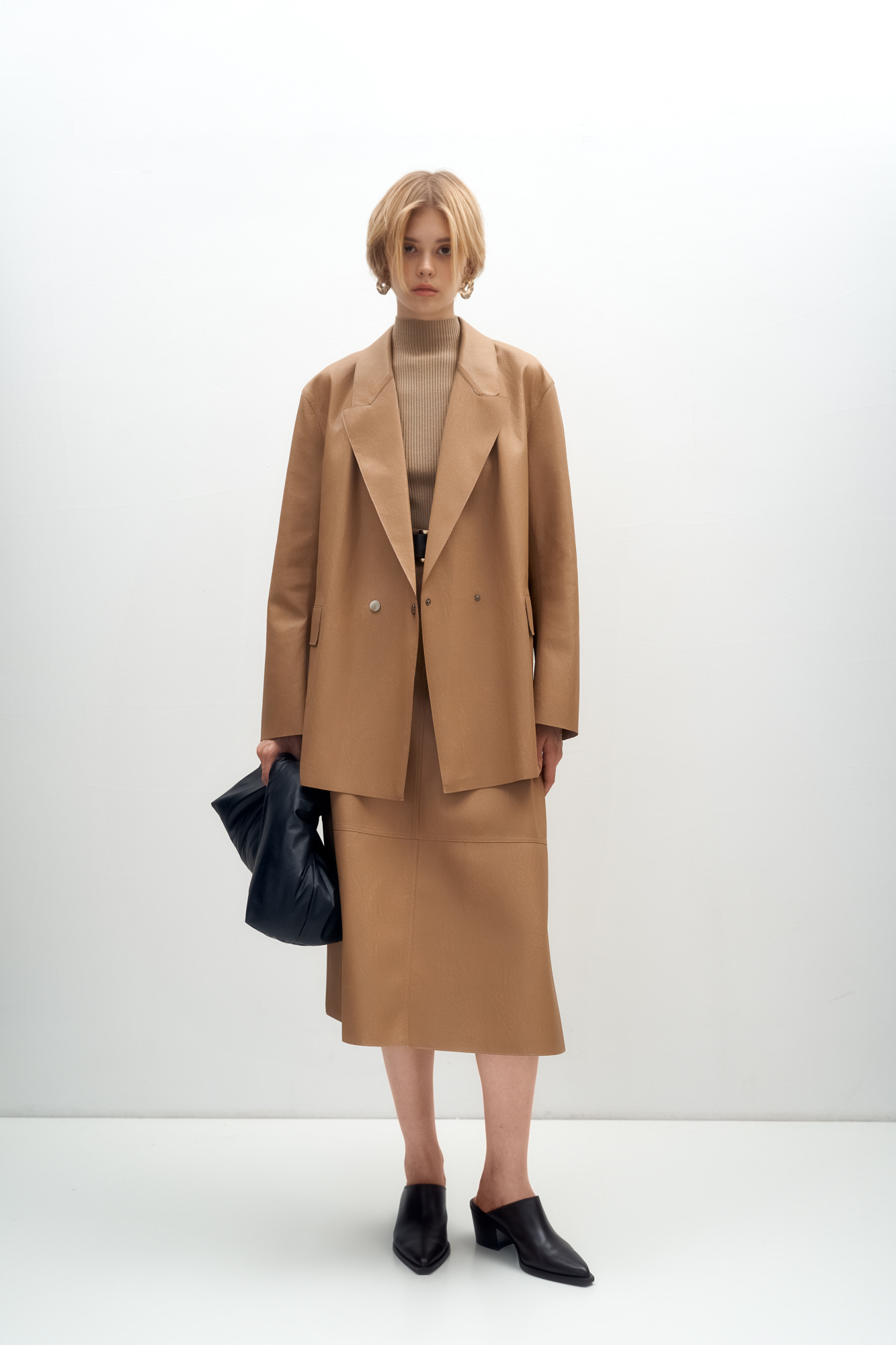 Calf-length faux leather A-line skirt with side pockets. Invisible zipper and button closure.The skirt emphasizes the waist and visually lengthens the silhouette.