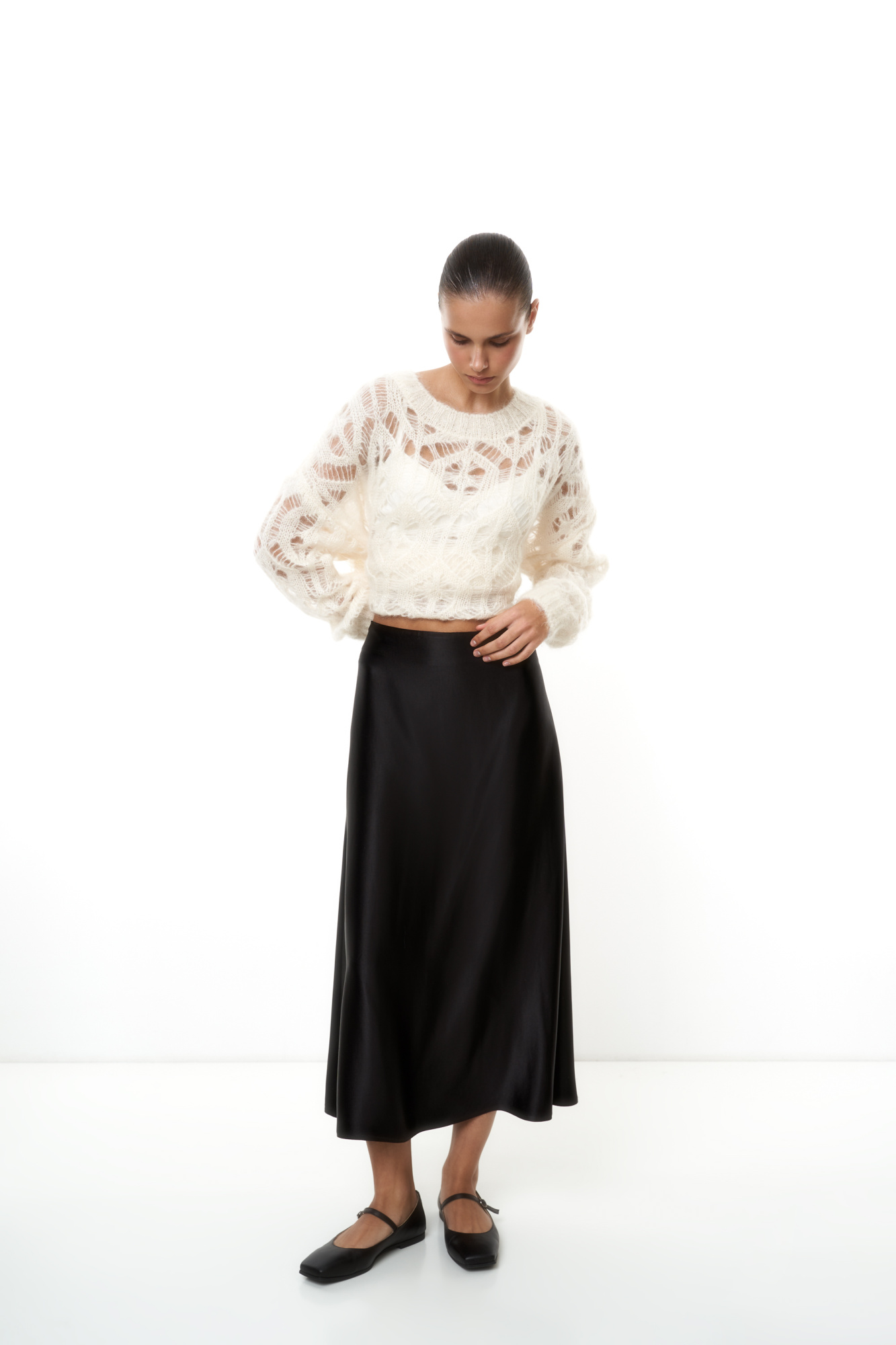 Satin midi skirt with a slight flare at the bottom. Composition - 100% viscose. Invisible side zip fastening, small elastic band at the back of the waistband.