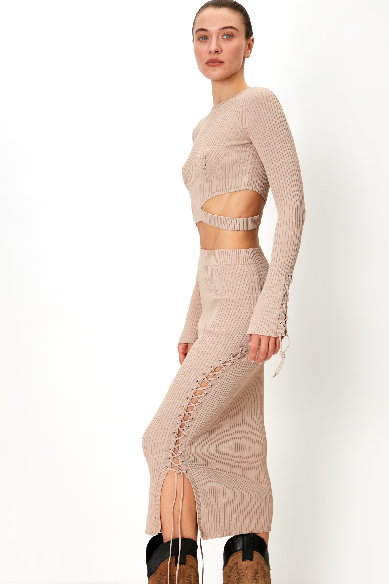 Viscose knitted midi skirt with laces on the sides. Pairs perfectly with tops.