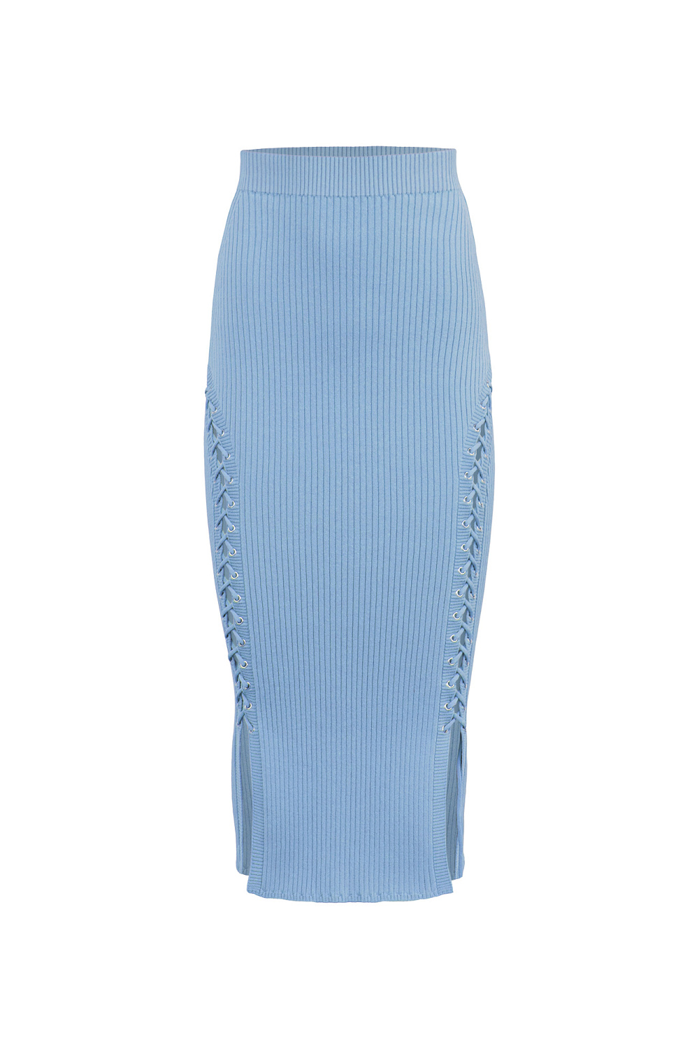 Viscose knitted midi skirt with laces on the sides. Pairs perfectly with tops.