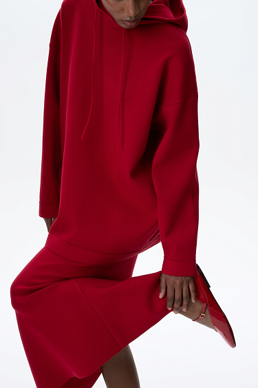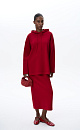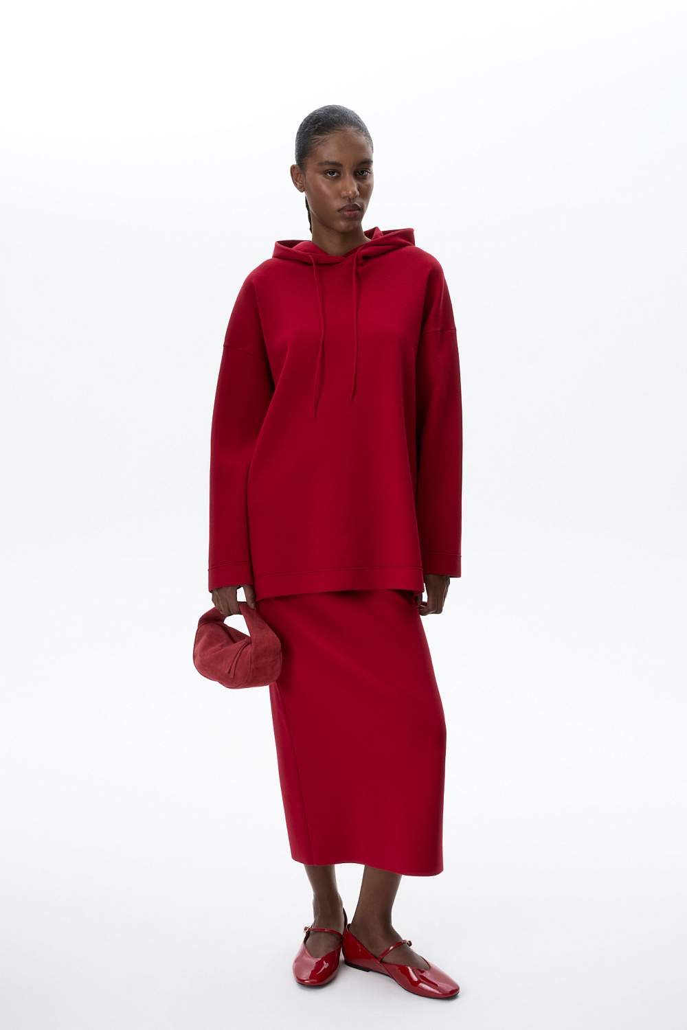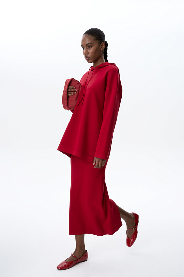 Knitted viscose skirt with a slit at the back and a ribbed elastic waistband.