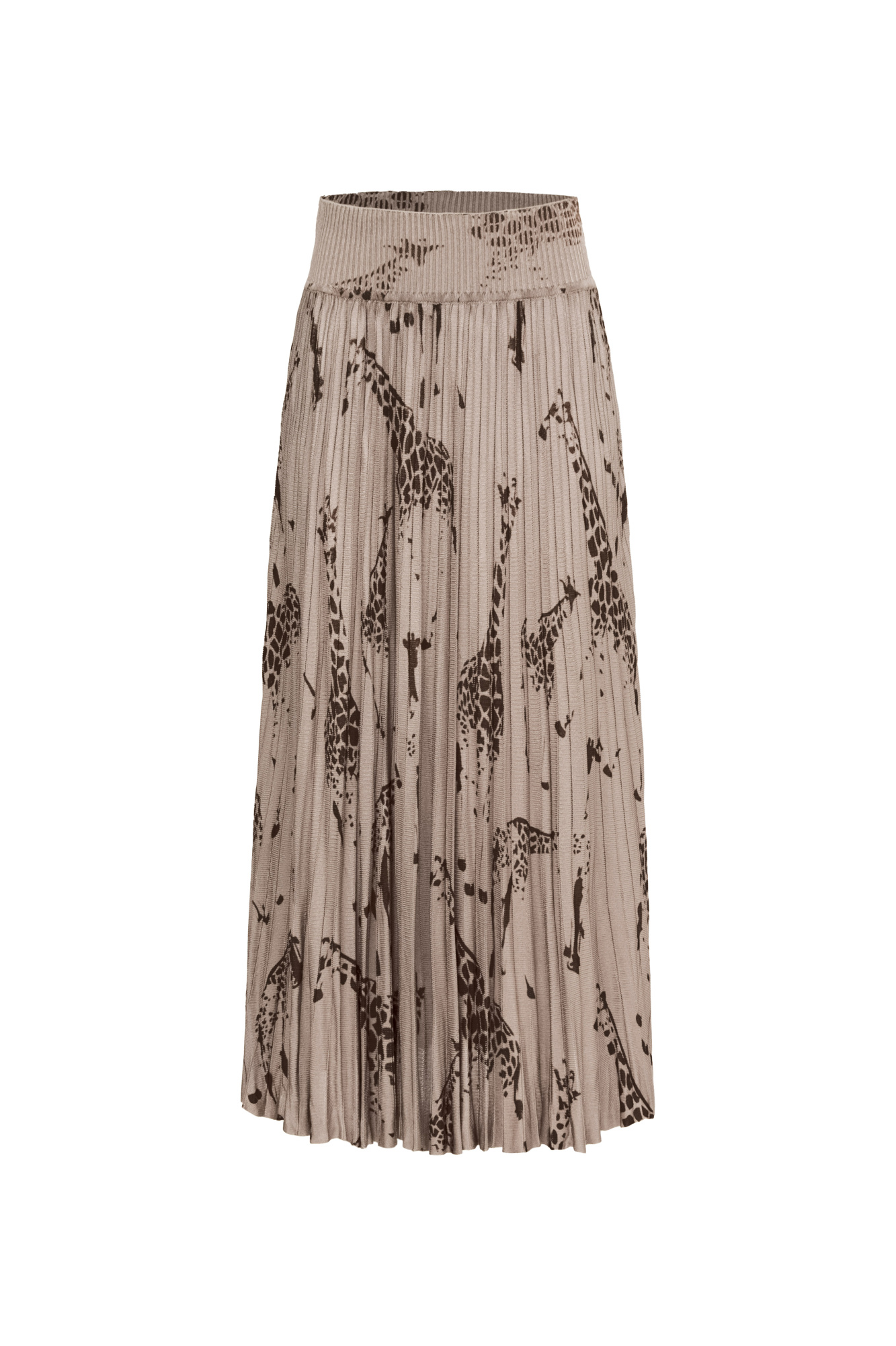 100% viscose printed pleated midi skirt with a ribbed elastic waistband and high raise. Pairs perfectly with a classic top.