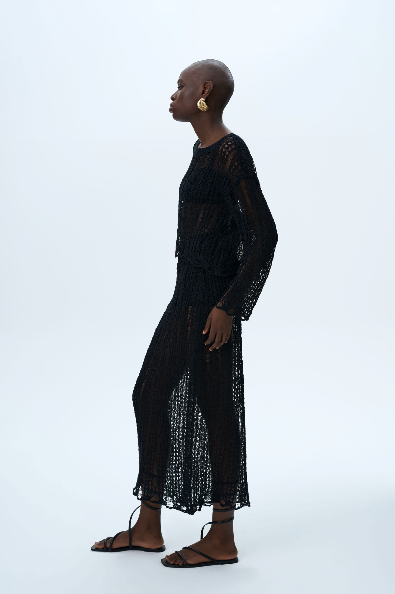 Semi-sheer openwork midi skirt. Features fitted silhouette with an elastic ribbed waistband. Pair perfectly with a matching jumper.