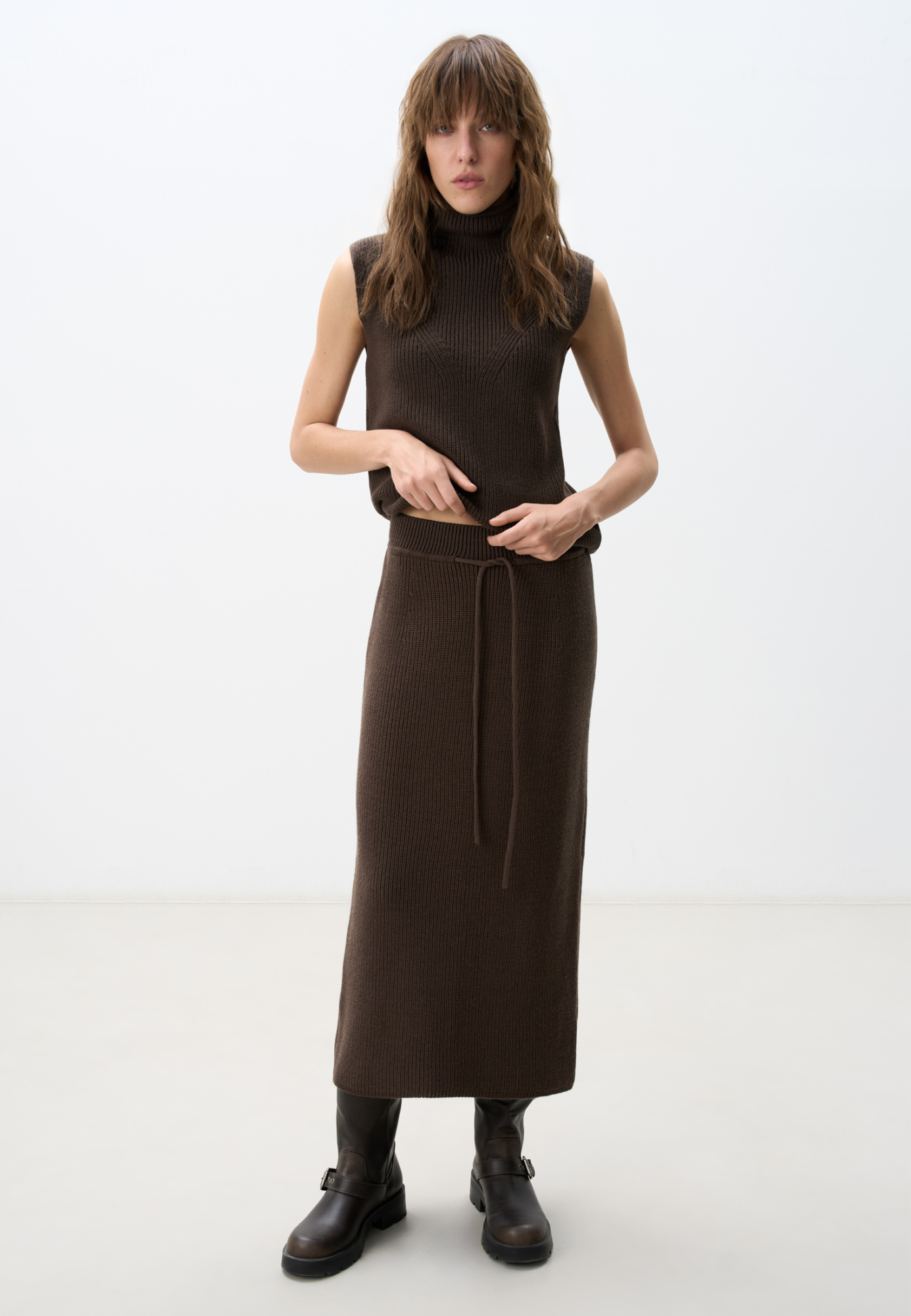 Midi length knitted skirt. Model of a straight silhouette with an elastic waistband with a drawstring. You can complement the look with a vest in the same style.