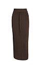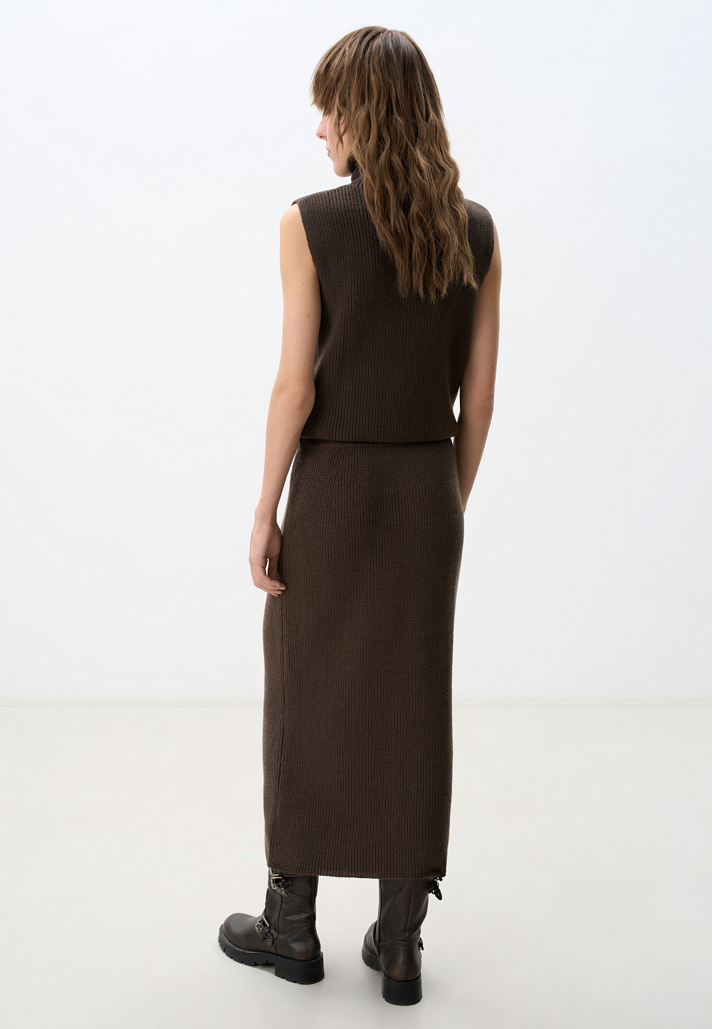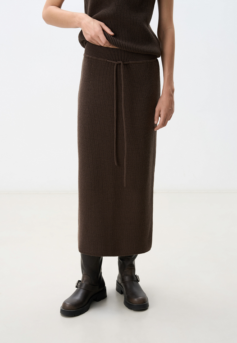 Midi length knitted skirt. Model of a straight silhouette with an elastic waistband with a drawstring. You can complement the look with a vest in the same style.