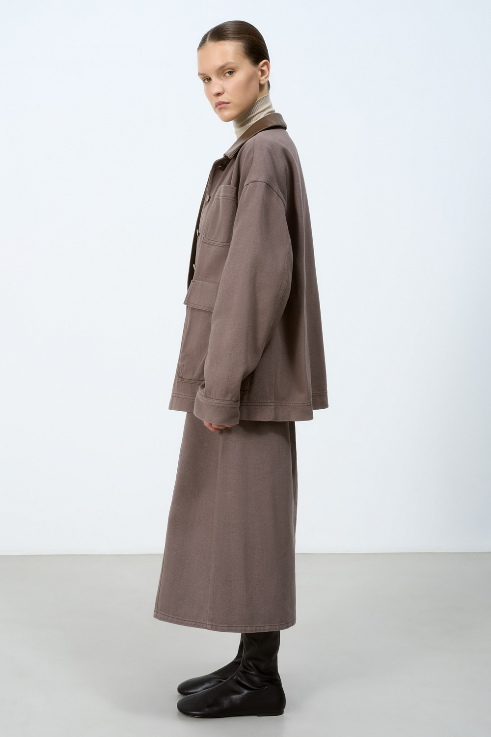100% cotton denim midi skirt. Five pockets, concealed zipper and button closure.