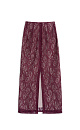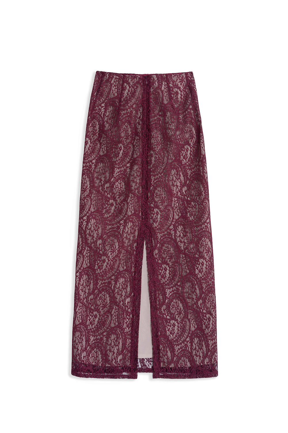 Midi-length skirt made of lace lined in a contrasting color. The model has a straight silhouette, with a slit at the back and a zipper closure.