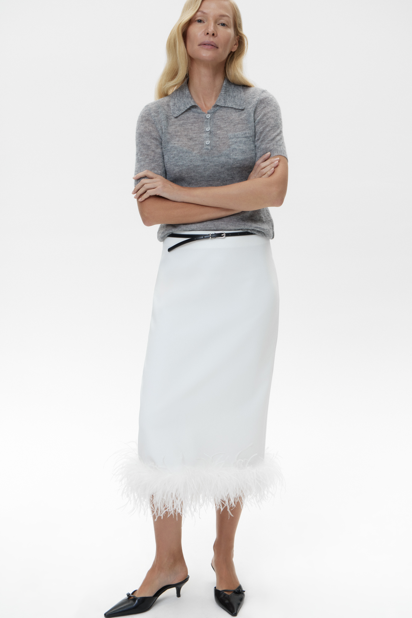 Straight midi skirt made of viscose. The model has a straight cut, with a slit at the back and a zipper closure. The product is decorated with ostrich feathers at the hem. The ribbon with feathers is detachable.