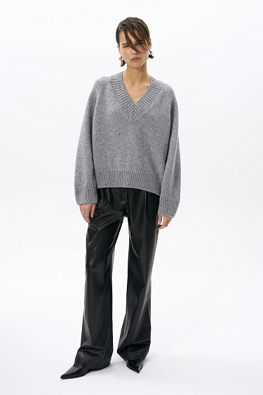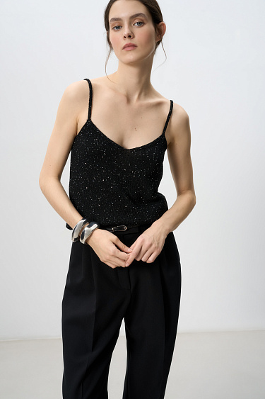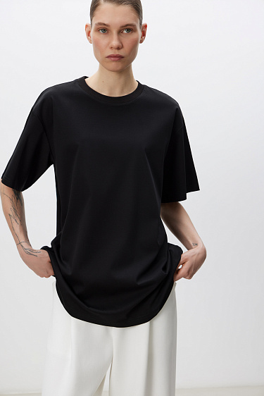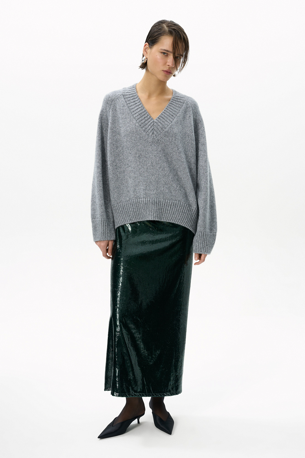 Shiny midi length skirt. The model has a straight silhouette, with a slit and a zipper at the back. The product is lined.