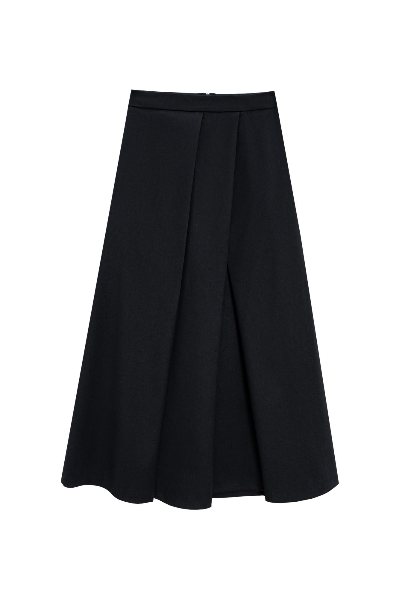 Midi length wool skirt. A-line model with large oblique pleats at the front. Zip fastening at the back. The product is unlined.