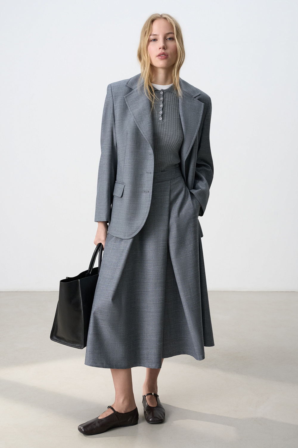 Midi length wool skirt. A-line model with large oblique pleats at the front. Zip fastening at the back. The product is unlined.
