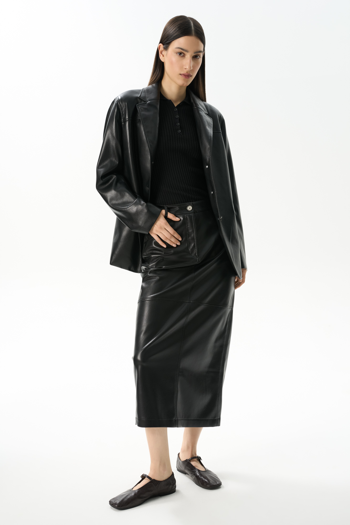 Midi-length skirt made of soft double-sided eco-leather. Straight cut model with a slit at the back, pockets and belt loops on the waistband. Button and zip fastening.
