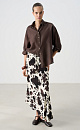 Printed midi length skirt made of 100% viscose. The model has a fitted silhouette, with a flowing flared skirt and a drawstring belt. Concealed zip fastening.