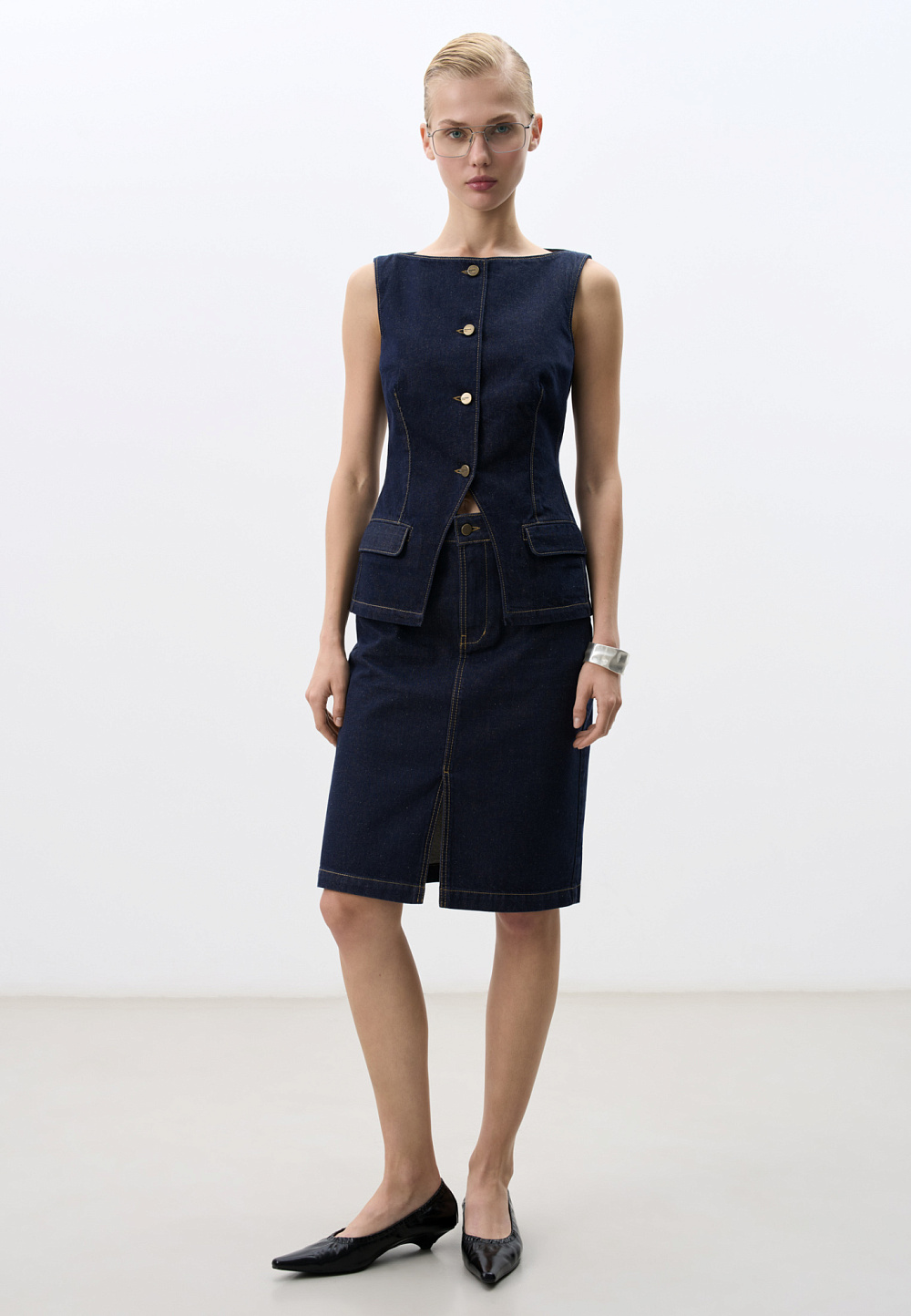 Midi length denim skirt made of 100% cotton. The model has a straight cut, with pockets, belt loops and a low slit in the front. Zip and button closure. You can complement the look with a jacket or vest.