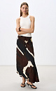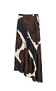 Knitted skirt made of thin viscose with a loose silhouette. A-line model with an asymmetrical hem, a narrow cord decorated with beads and a zipper on the side.