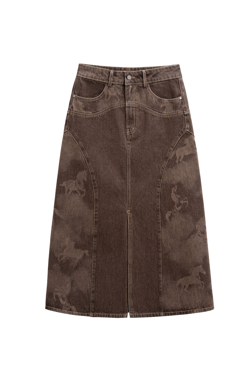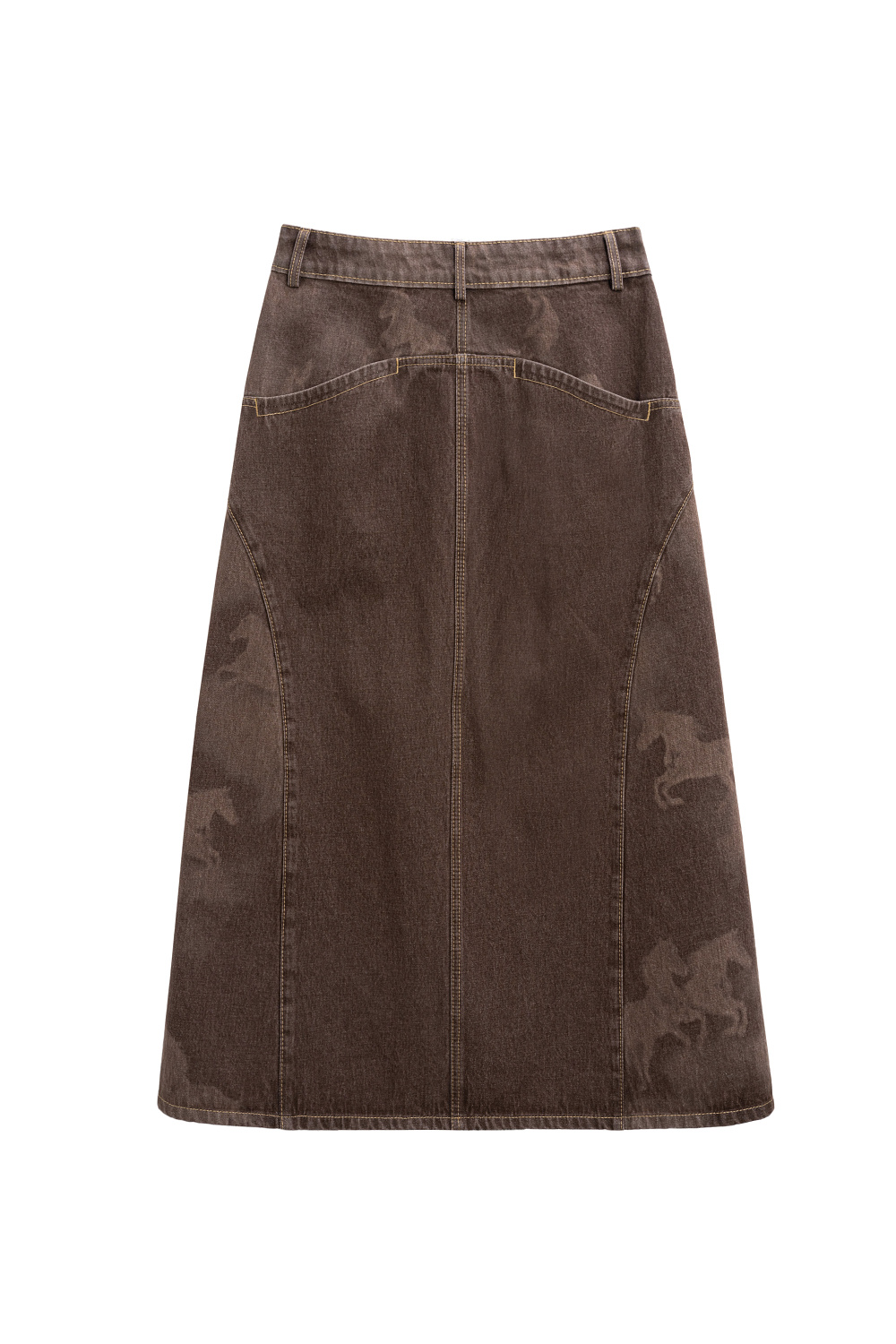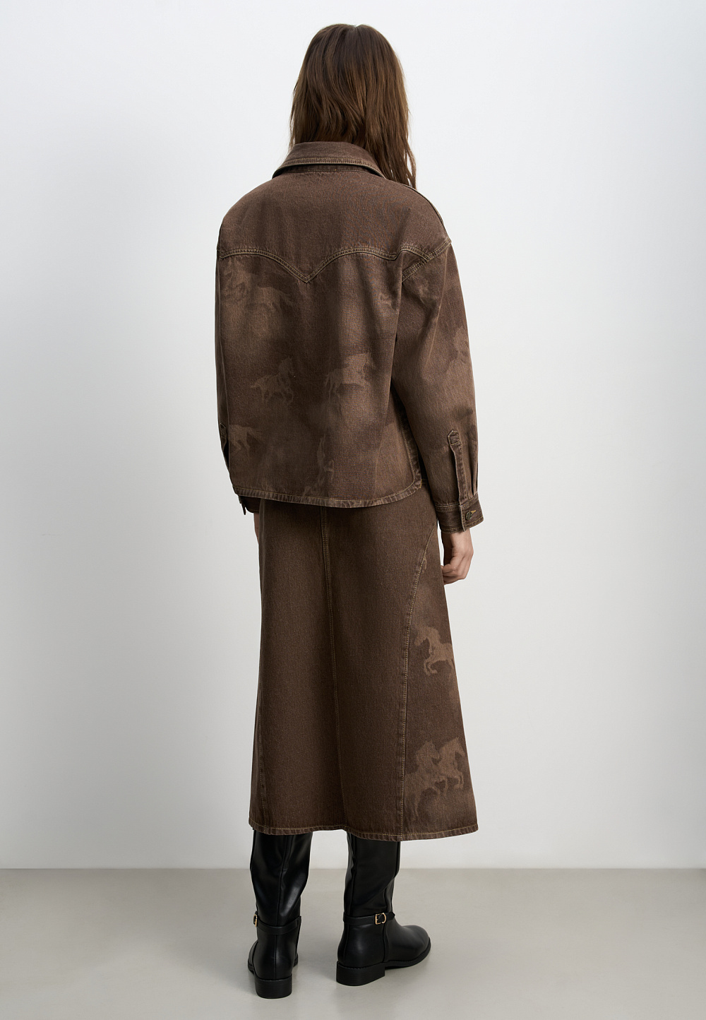 100% cotton midi length denim skirt with horse print. Features a front slit, geometric darts, side and back pockets, belt loops and metal button closure with the brand logo. The product is decorated with a laser-cut horse and horseshoe print and voluminous geometric darts.