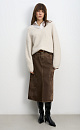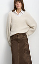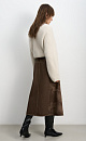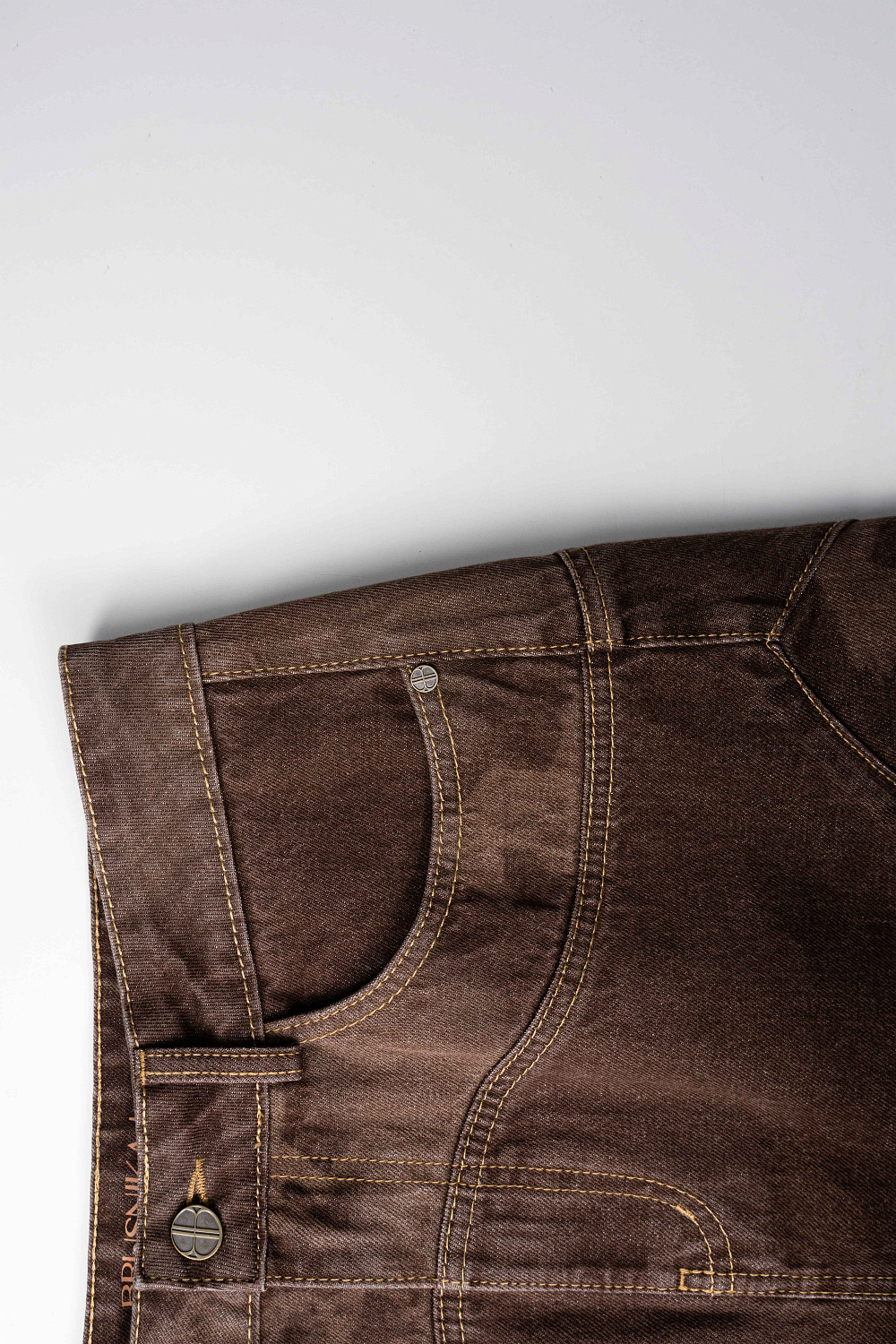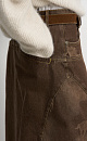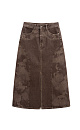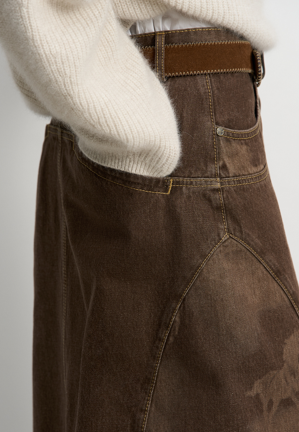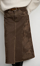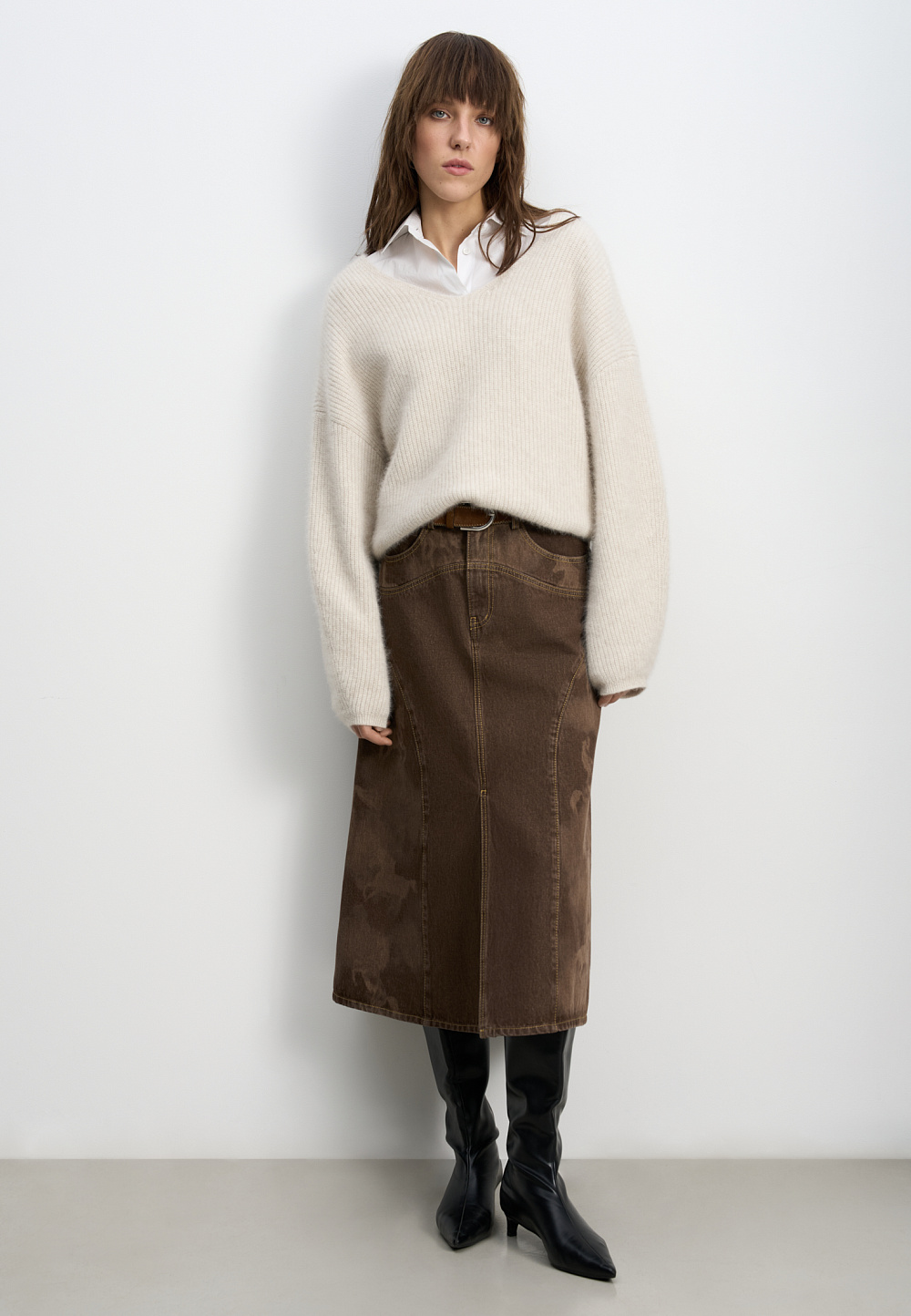 100% cotton midi length denim skirt with horse print. Features a front slit, geometric darts, side and back pockets, belt loops and metal button closure with the brand logo. The product is decorated with a laser-cut horse and horseshoe print and voluminous geometric darts.