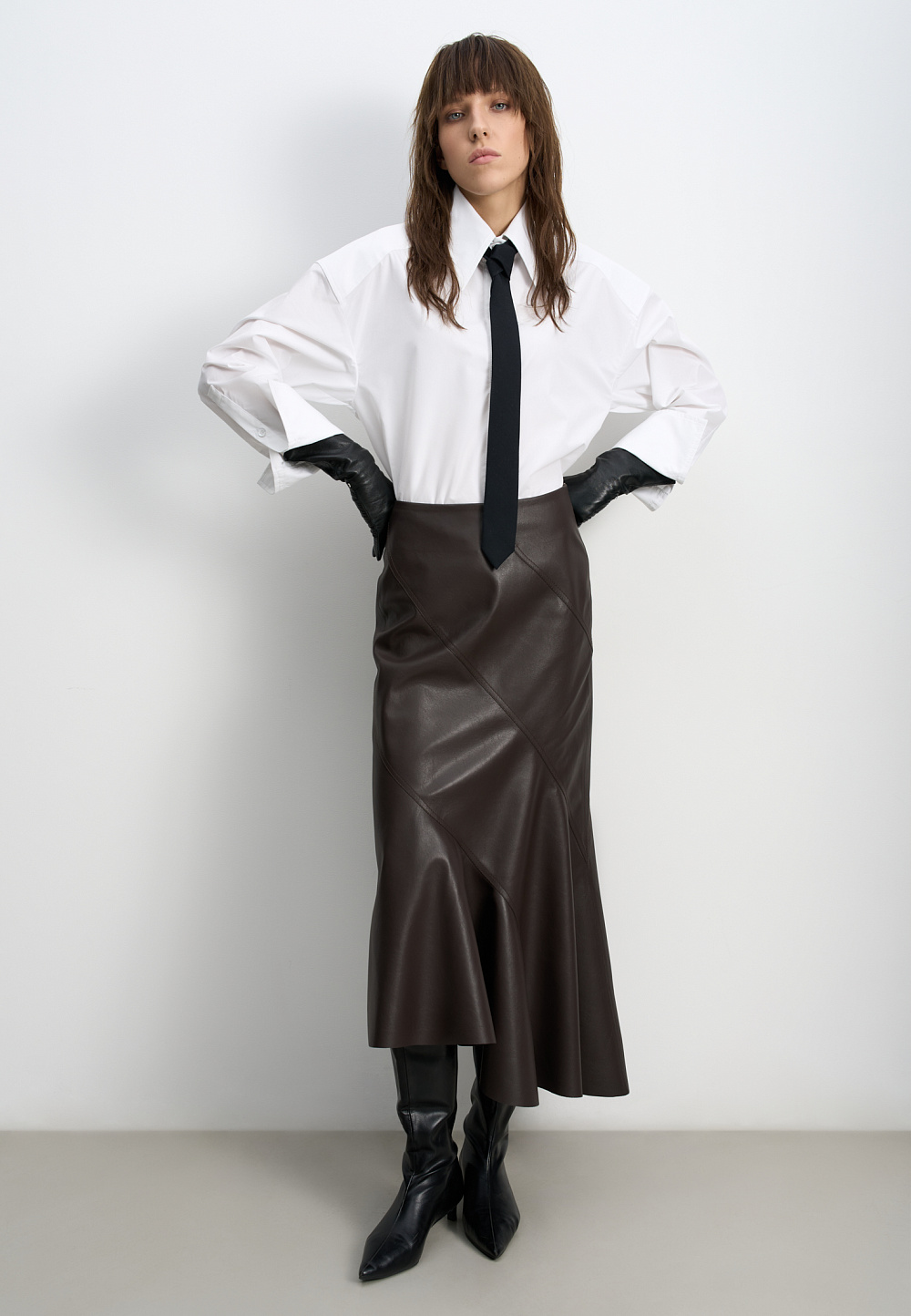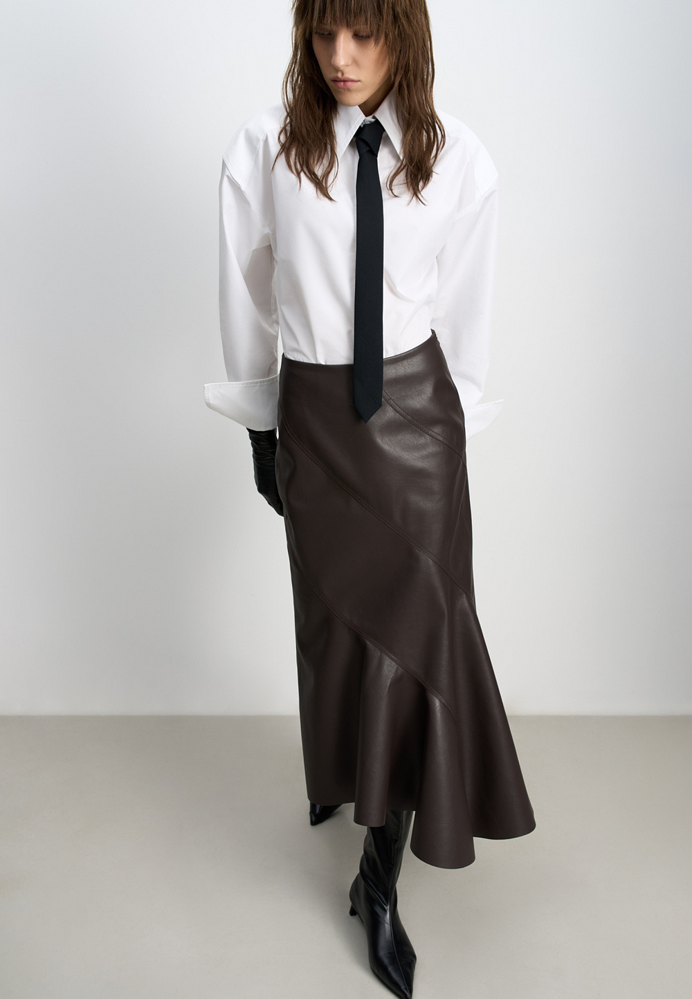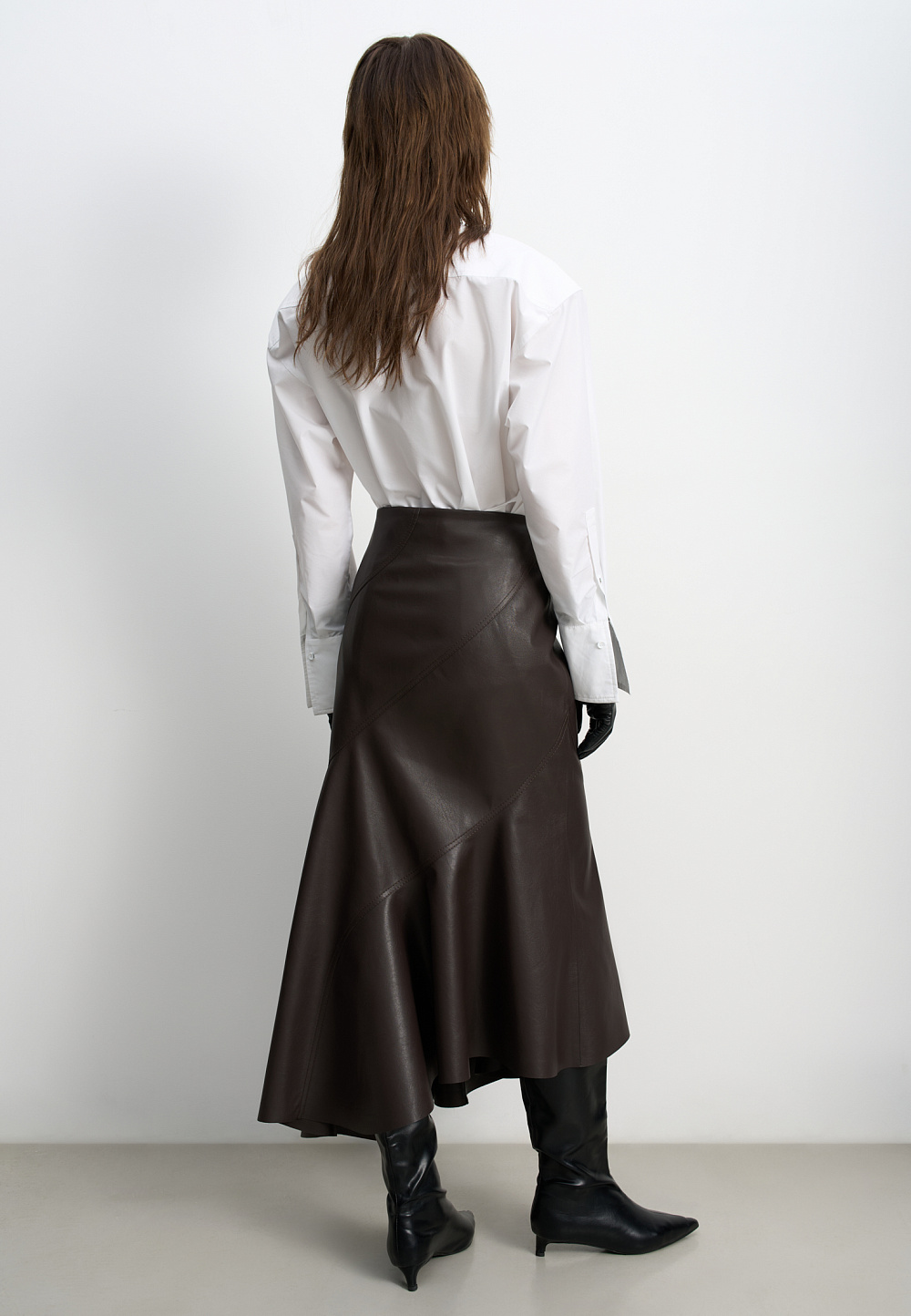 Asymmetrical eco-leather midi-length skirt. A fitted model with a flared hem and slanted pleats. Side zip fastening.