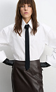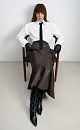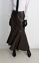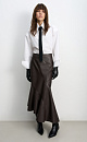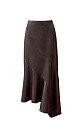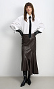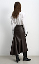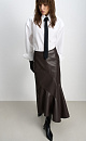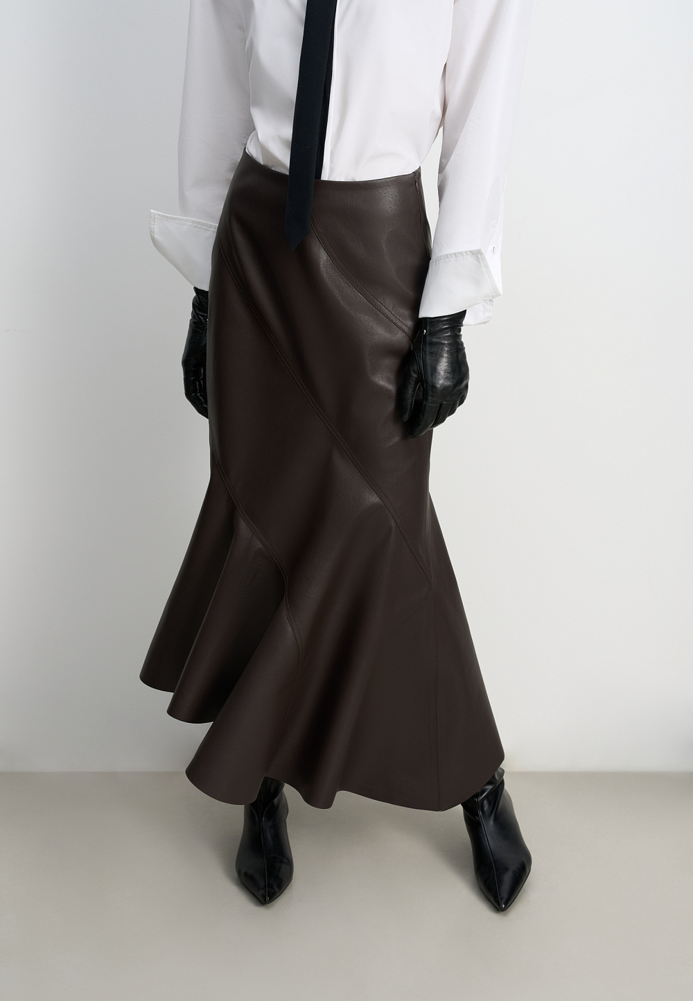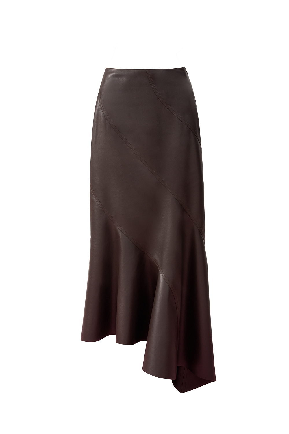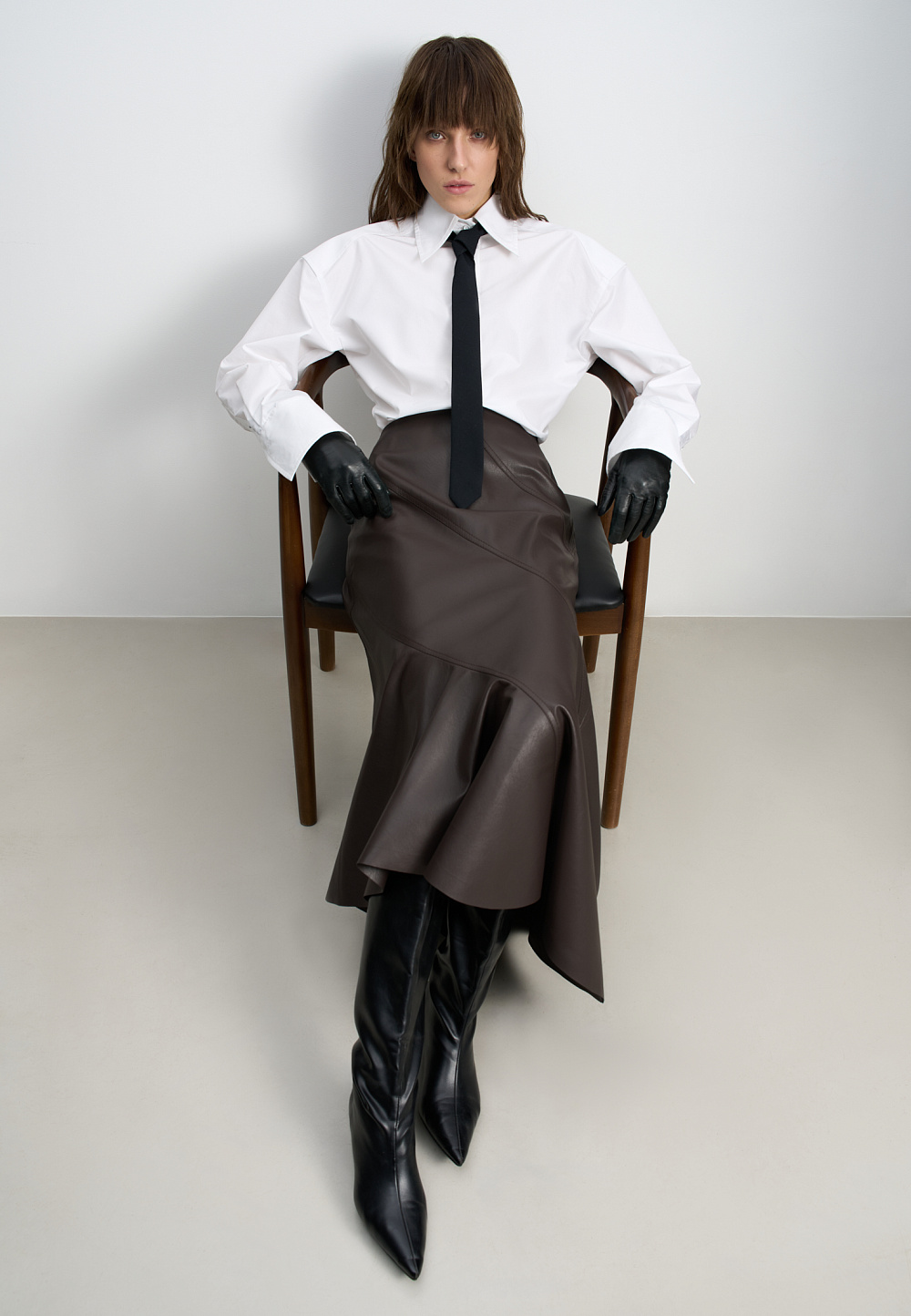Asymmetrical eco-leather midi-length skirt. A fitted model with a flared hem and slanted pleats. Side zip fastening.