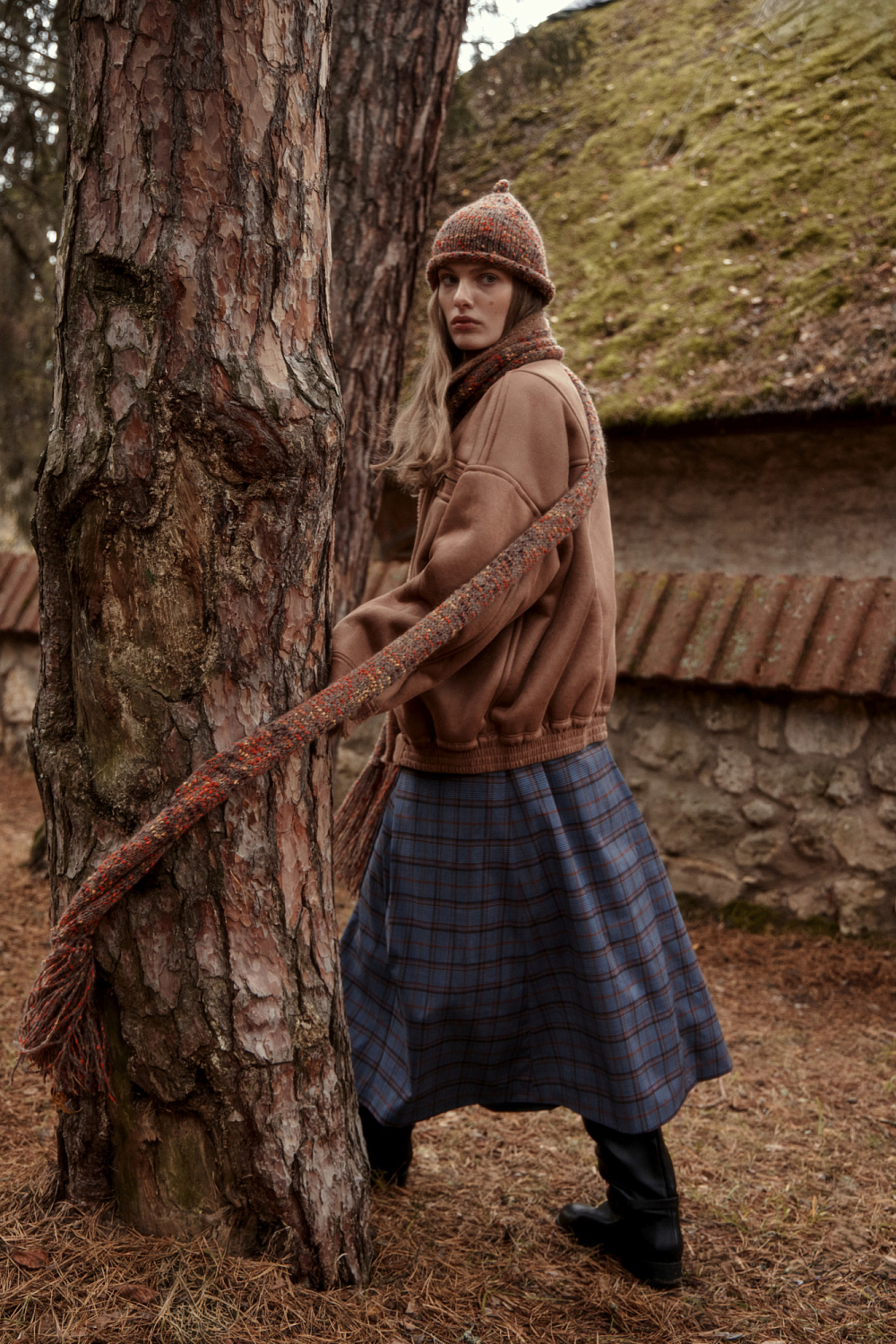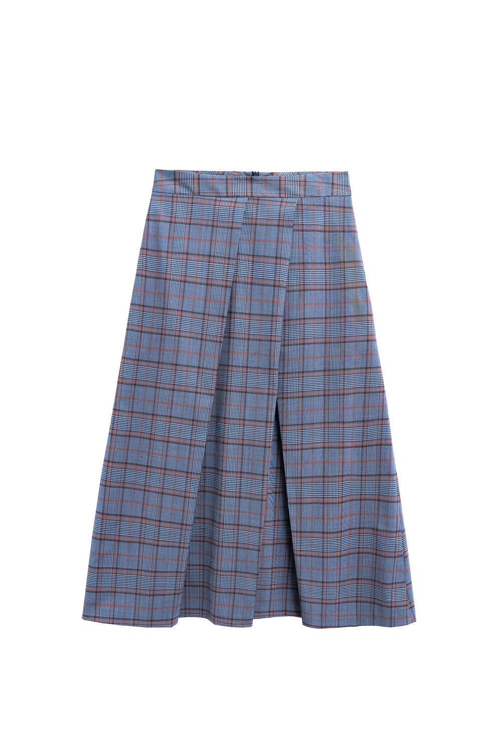 Midi-length skirt in checked wool. A-line model with large oblique pleats at the front. Zip fastening at the back. The product is unlined.