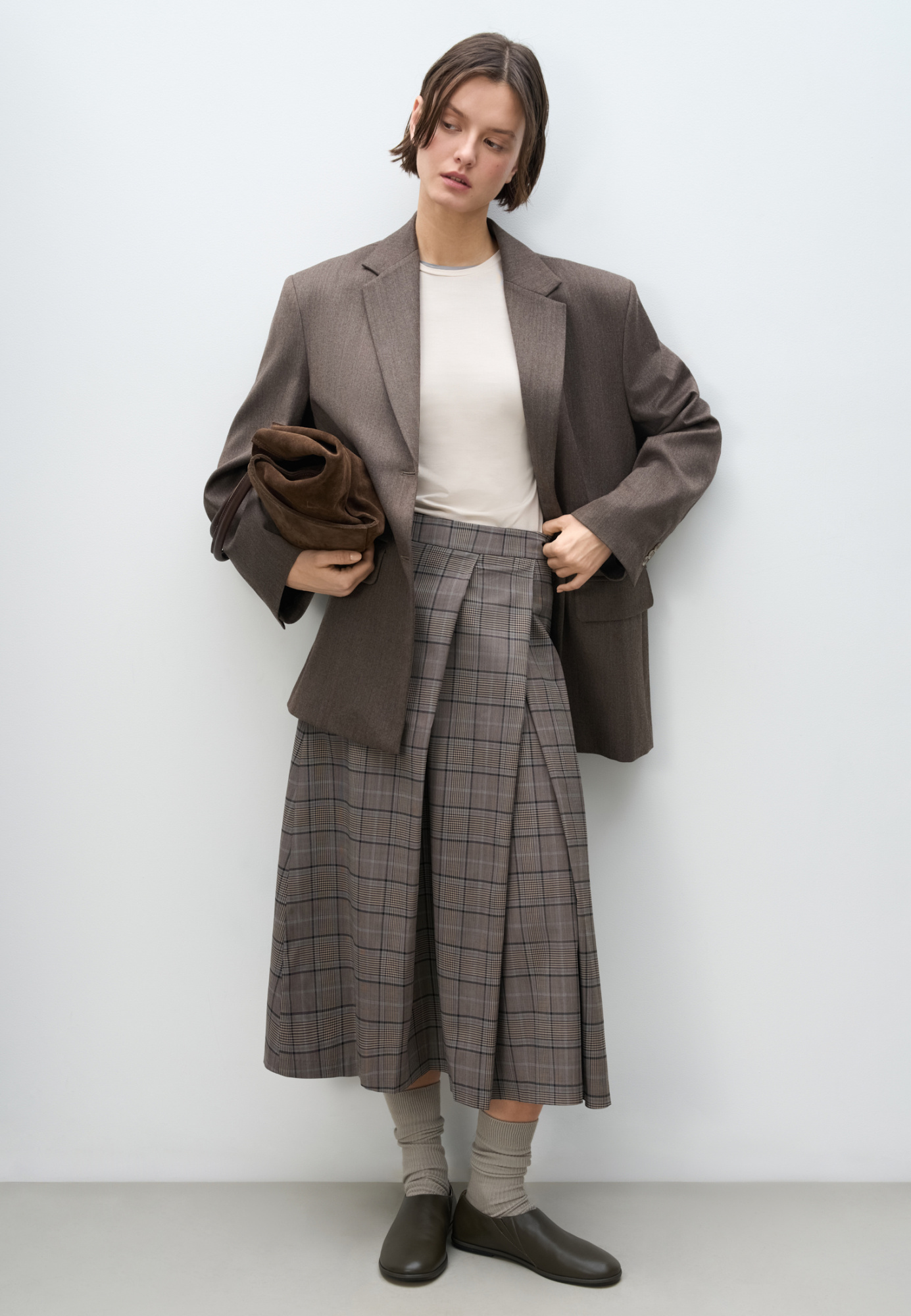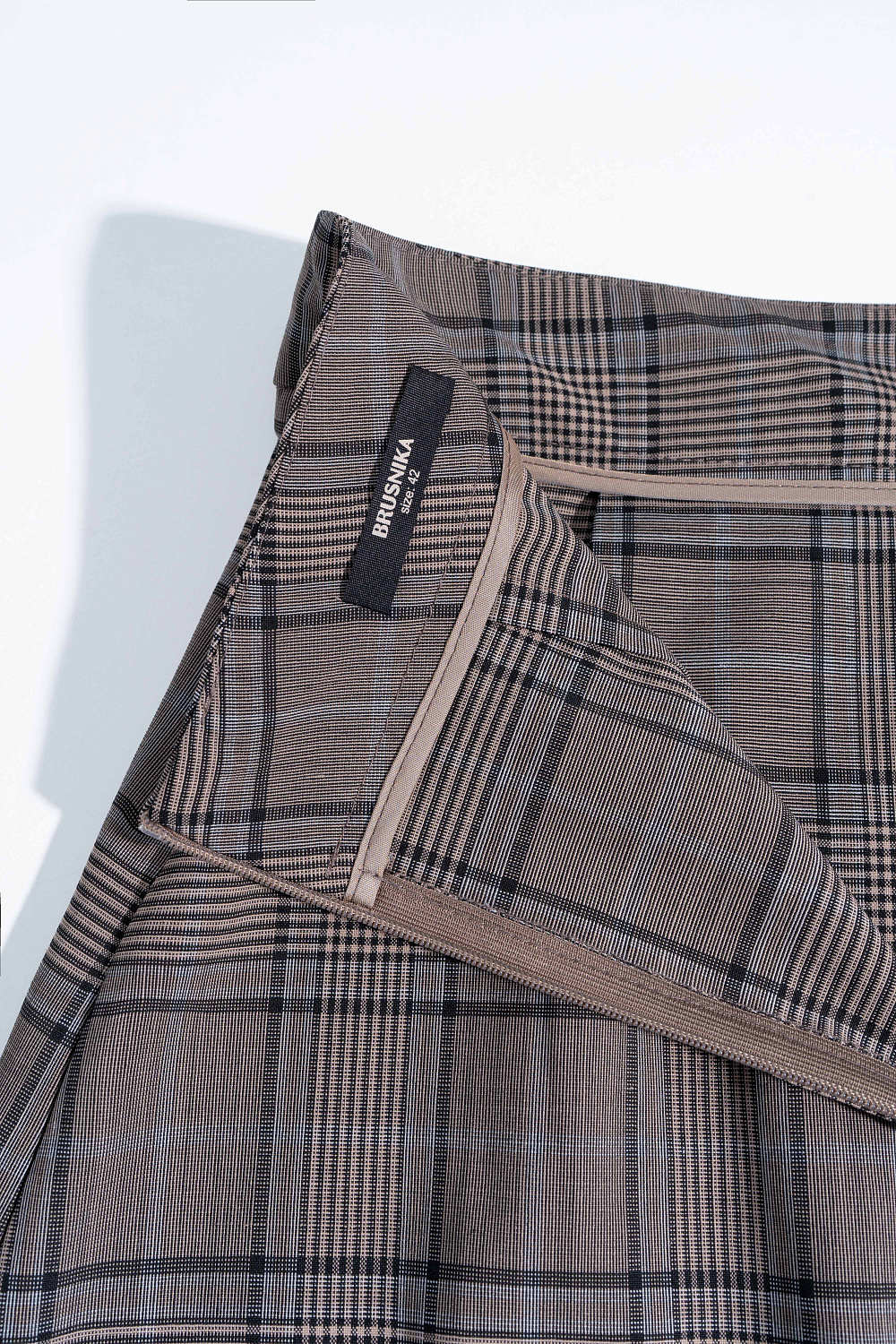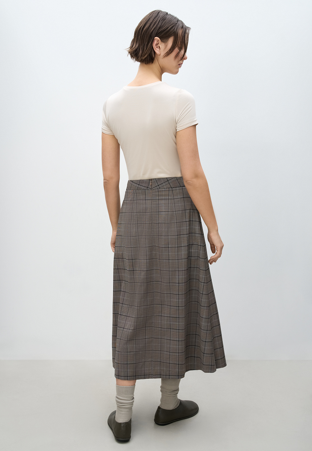 Midi-length skirt in checked wool. A-line model with large oblique pleats at the front. Zip fastening at the back. The product is unlined.