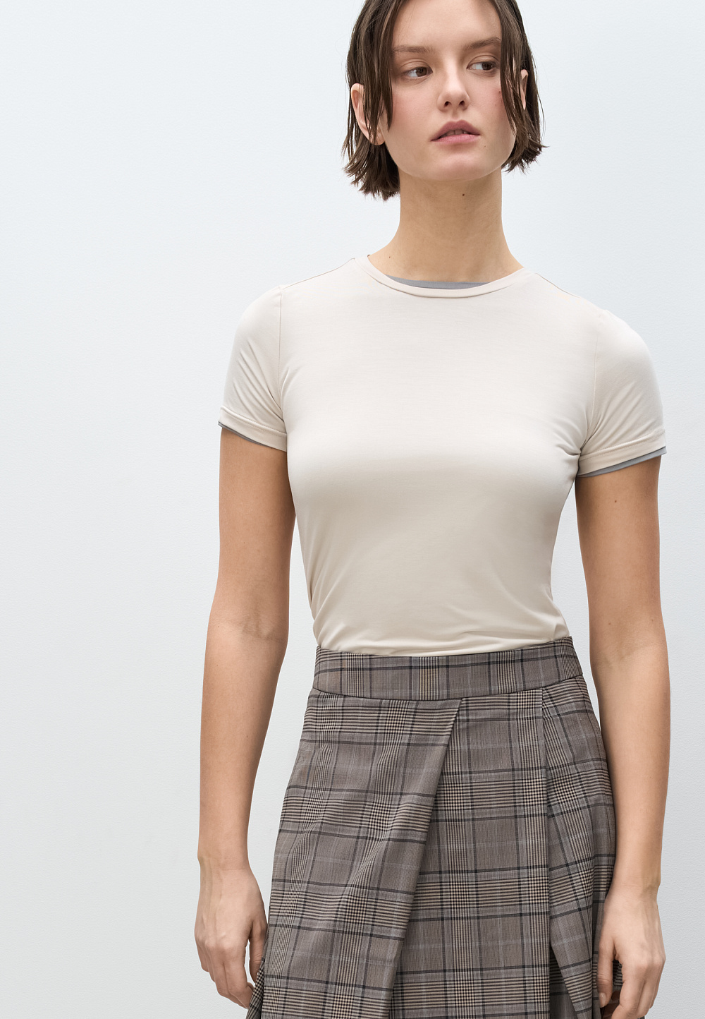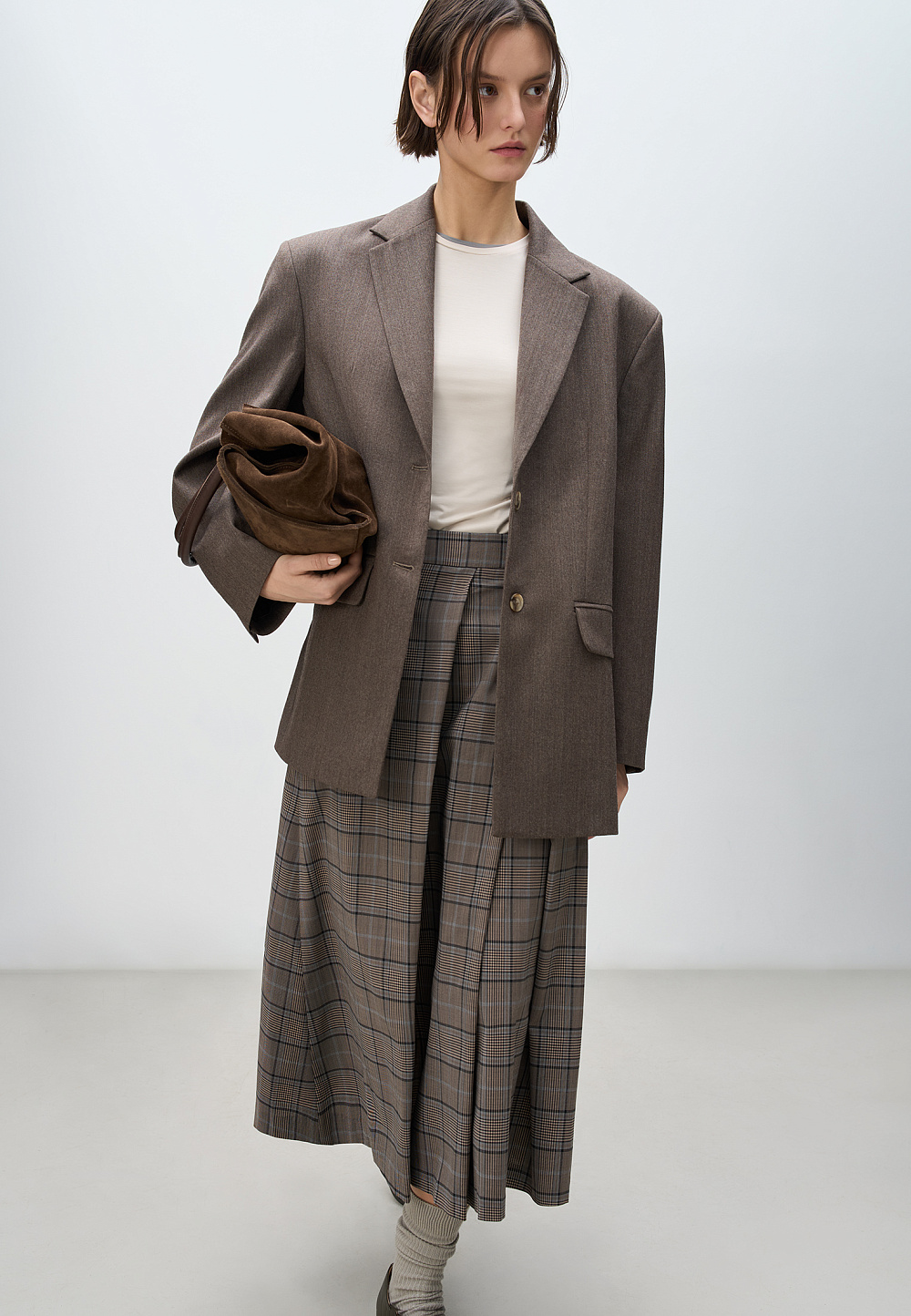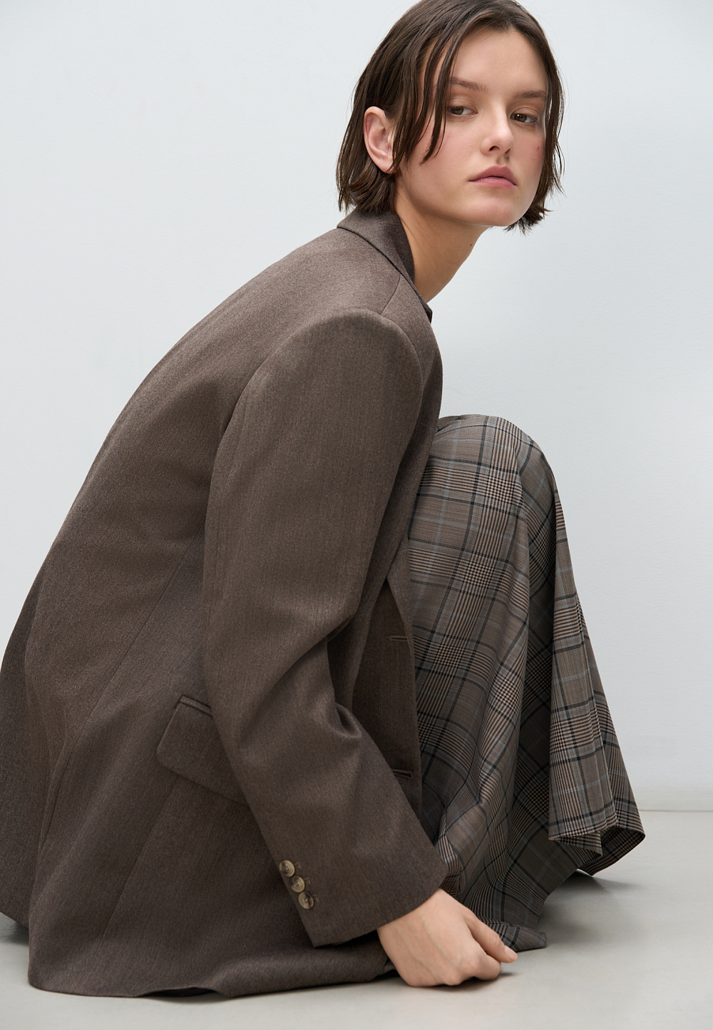 Midi-length skirt in checked wool. A-line model with large oblique pleats at the front. Zip fastening at the back. The product is unlined.
