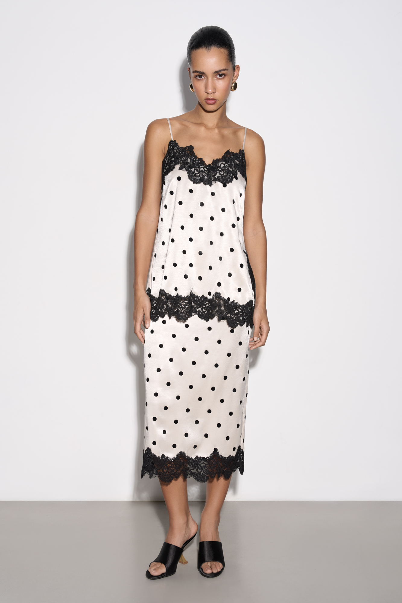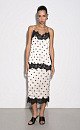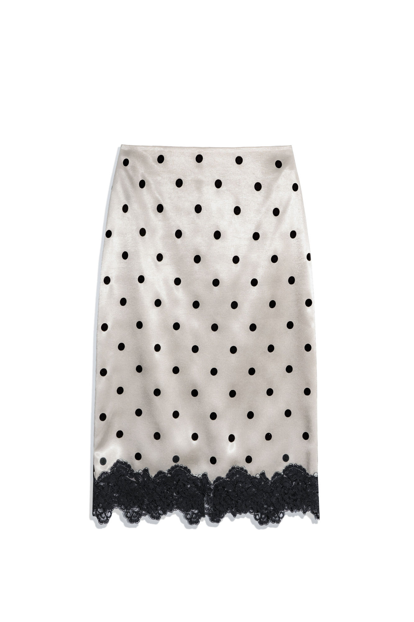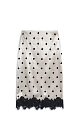 Midi length satin polka dot skirt. Fitted model with hidden zipper closure. The hem of the product is decorated with lace.