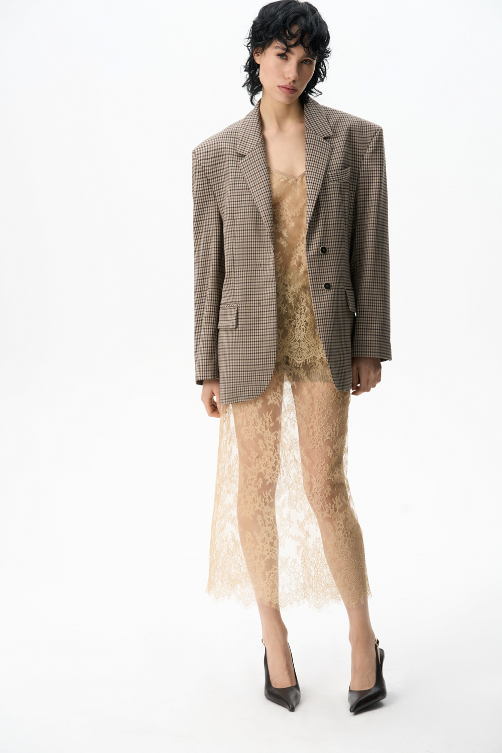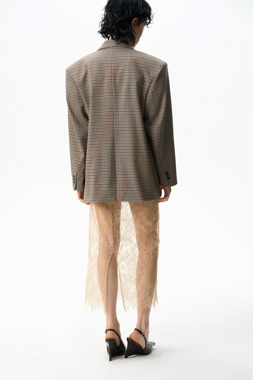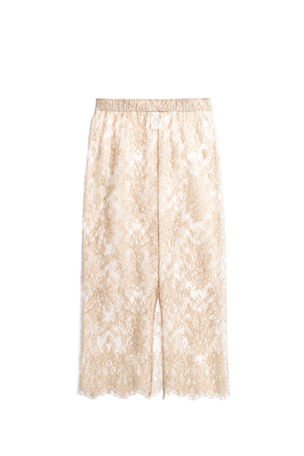 Midi-length skirt made of thin lace. Model with a high slit at the back and a hidden zip fastening. The product is made without lining.