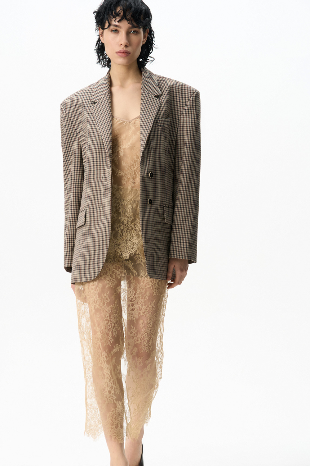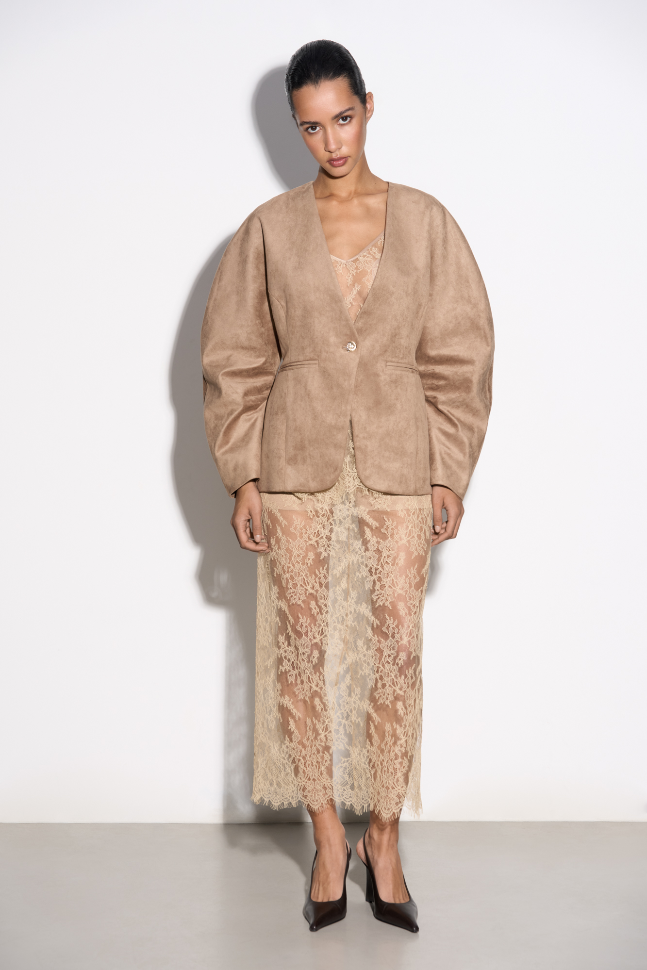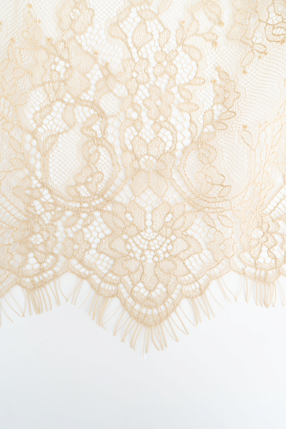 Midi-length skirt made of thin lace. Model with a high slit at the back and a hidden zip fastening. The product is made without lining.