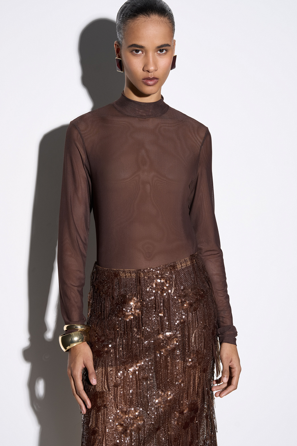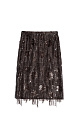 Midi-length skirt with geometric patterns embroidered with transparent sequins. The model is decorated with a scattering of sequins and fringe at the hem. The product is made without lining.