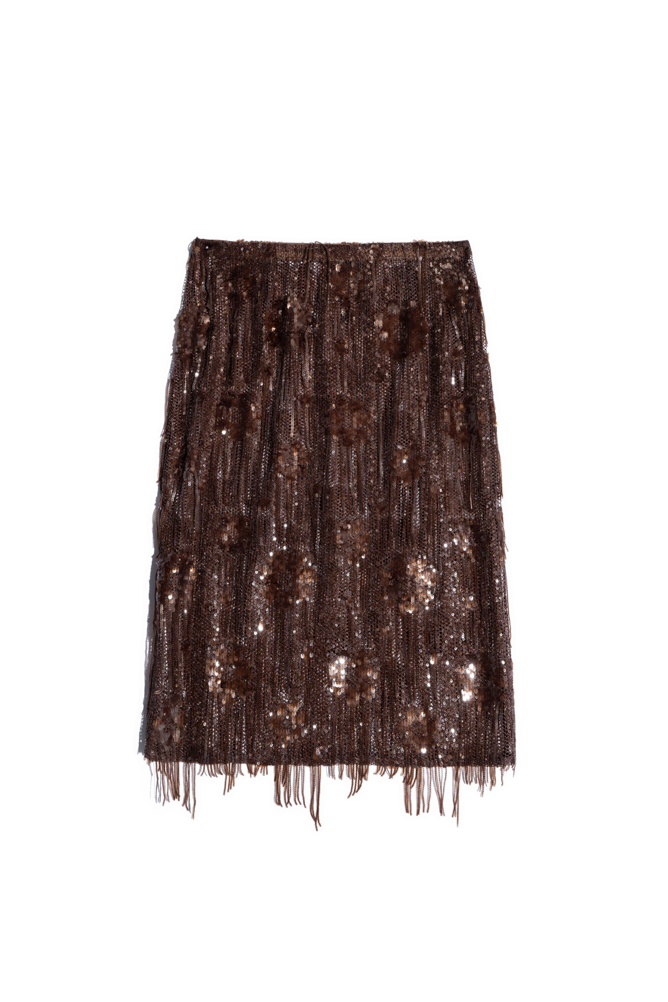 Midi-length skirt with geometric patterns embroidered with transparent sequins. The model is decorated with a scattering of sequins and fringe at the hem. The product is made without lining.