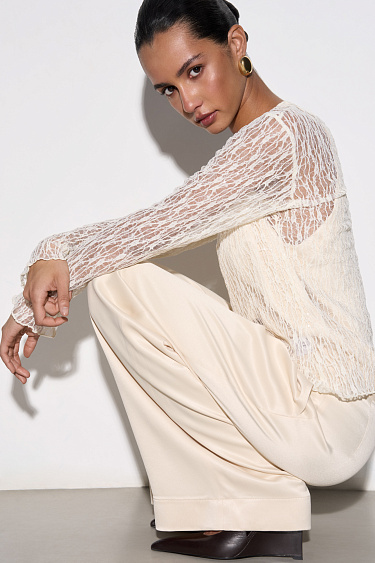 Midi-length balloon skirt made of satin fabric. The model is made in a large fold. Concealed zip fastening.